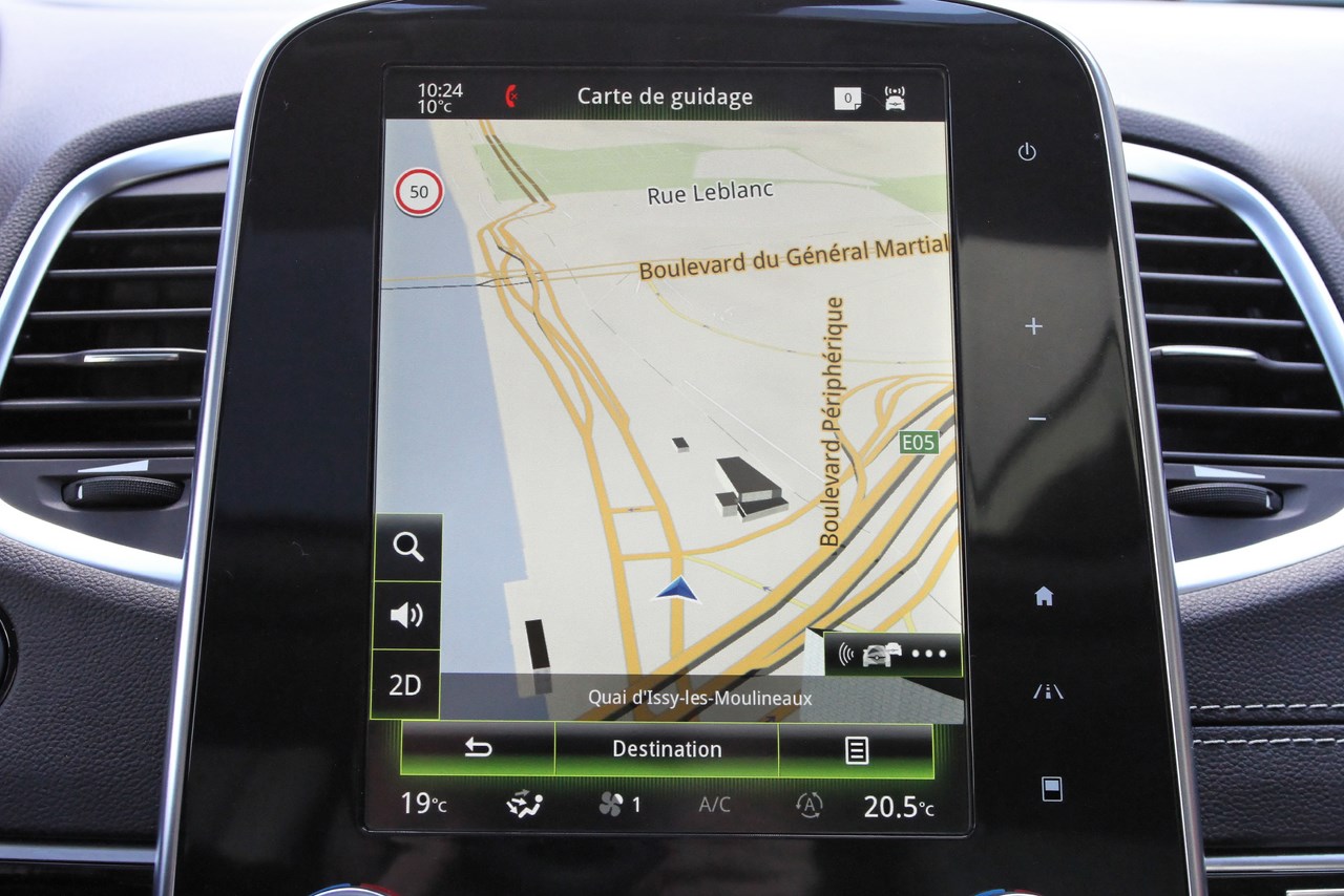 Avec un prix d’attaque qui débute à 34 200 € (Espace Life dCi 130 BVM 6), l’Espace 5 échelonne ses tarifs sur 4 gammes distinctes (Life, Zen, Intens, Initiale Paris). Notre version “Initiale Paris” et son moteur essence tCe 200 sont facturés 44 800 € (46 300 € en dCi 160). Richement doté, elle réunit un équipement pléthorique pour le confort et la sécurité de ses passagers. Les équipements de confort sont définis par un GPS à navigation TOM TOM en 3D, la reconnaissance vocale (navigation, téléphone et lecture des Emails), le Bluetooth (téléphone et streaming audio), les connections de la console centrale (2 USB, 1 jack 3,5 mm et 1 carte SD), le système Multi-Sense, la modularité One-Touch, les sièges électriques à mémoires, la radio, la climatisation, le réglage de l’ambiance lumineuse (couleur et intensité), une installation hi-fi Bose, l’Easy Park Assist (caméra de recul, capteurs AV/AR) et l’affichage vision tête haute. Pour la sécurité le nouveau Renault Espace embarque le pack 4Control (châssis à 4 roues directrices) à l’amortissement piloté, 6 airbags (frontaux, latéraux tête / thorax, rideaux), des appuie-têtes anti coup du lapin, les fixations Isofix, l’alerte de distance sécurité (respect des distances de sécurité), le Freinage Actif d’Urgence, l’alerte de survitesse avec reconnaissance des panneaux, l’alerte de franchissement de ligne, la commutation automatique des feux de route/croisement, le régulateur de vitesse Adaptif, le détecteur de pression des pneumatiques, l’avertisseur d’angles mort, l’ABS et l’anti patinage. L’ensemble de ces équipements sont contrôlés via la tablette à écran tactile (8,7″) Renault “R-Link 2”, son utilisation nécessitant parfois une connexion* pour le téléchargement des applications et l’utilisation de certains services (TomTom Traffic et Coyote).