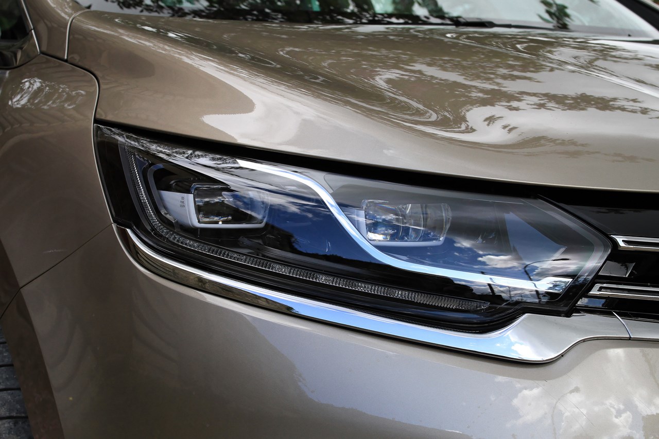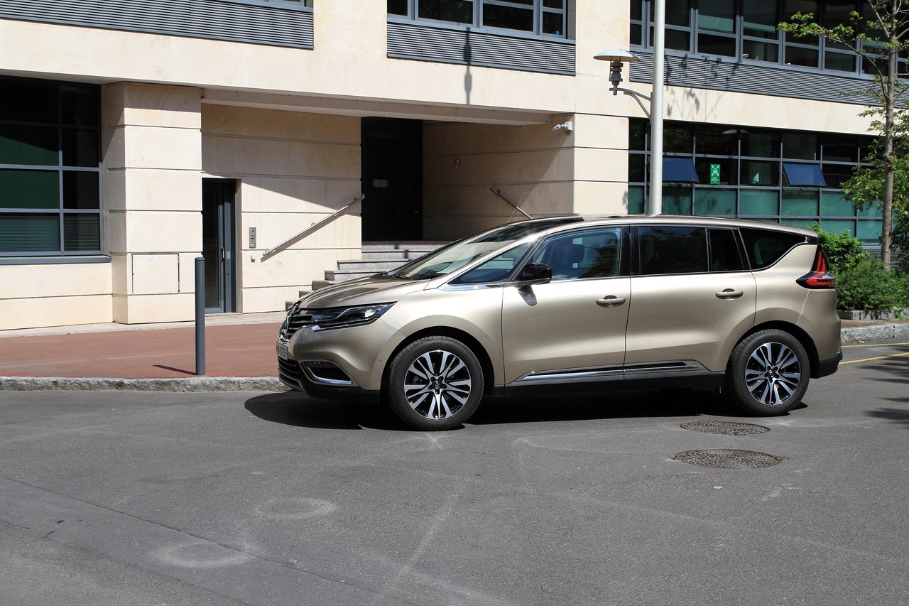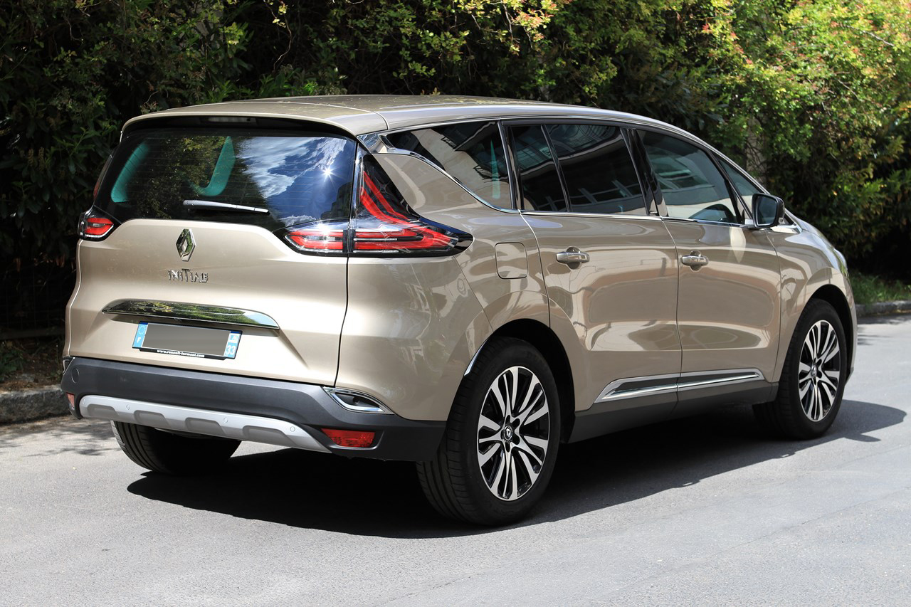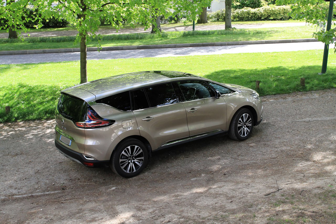 Quand on regarde l’Espace 5, il est clair que l’appellation “monospace” ne lui correspond plus. Le service marketing préfère l’appellation “Crossover” et sa nouvelle ligne tendue lui sied à merveille. Pour y parvenir les designers conservent la longueur du Grand Espace 4 (4,86 m), abaissent le pavillon de 7 cm (1,68 m contre 1,75 m auparavant), rehausse la garde au sol à 16 cm (+ 3 cm) et augmente la largeur de 3 cm (1,89 m). Ainsi taillé, l’Espace 5 ne passe pas inaperçu et s’impose avec une carrure de colosse. Pour plus de légèreté, le designer  Laurens Van Den Acker lui a greffé des vitres latérales amincies, qui participent à l’équilibre de la ligne en offrant une ceinture de caisse surélevée. Mais c’est certainement sur la face avant que l’auteur s’est le plus lâché. Au-delà d’une large et haute calandre chromée siglée “Initiale”, l’Espace 5 se démarque par des feux Full LED joliment dessinés. L’ensemble est souligné d’un spoiler type “Crossover” doté d’une protection aluminium (que l’on retrouve à l’arrière), d’une large prise d’air et de fausses écopes d’air cerclées de chromes qui intègrent des clignotants à LED. Ainsi dessiné, l’Espace 5 délivre une dose d’agressivité et de raffinement jusqu’ici inconnue des précédentes versions. Petits bémols, les vitres de custodes arrière manquent d’originalité et les feux arrière à LED font trop plastique. Toutes les versions sont équipées en série d’un toit vitré dans le prolongement du pare-brise avec, en option, un toit ouvrant panoramique.