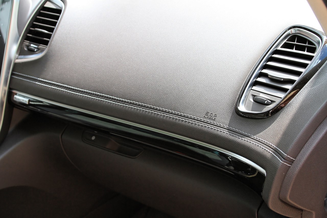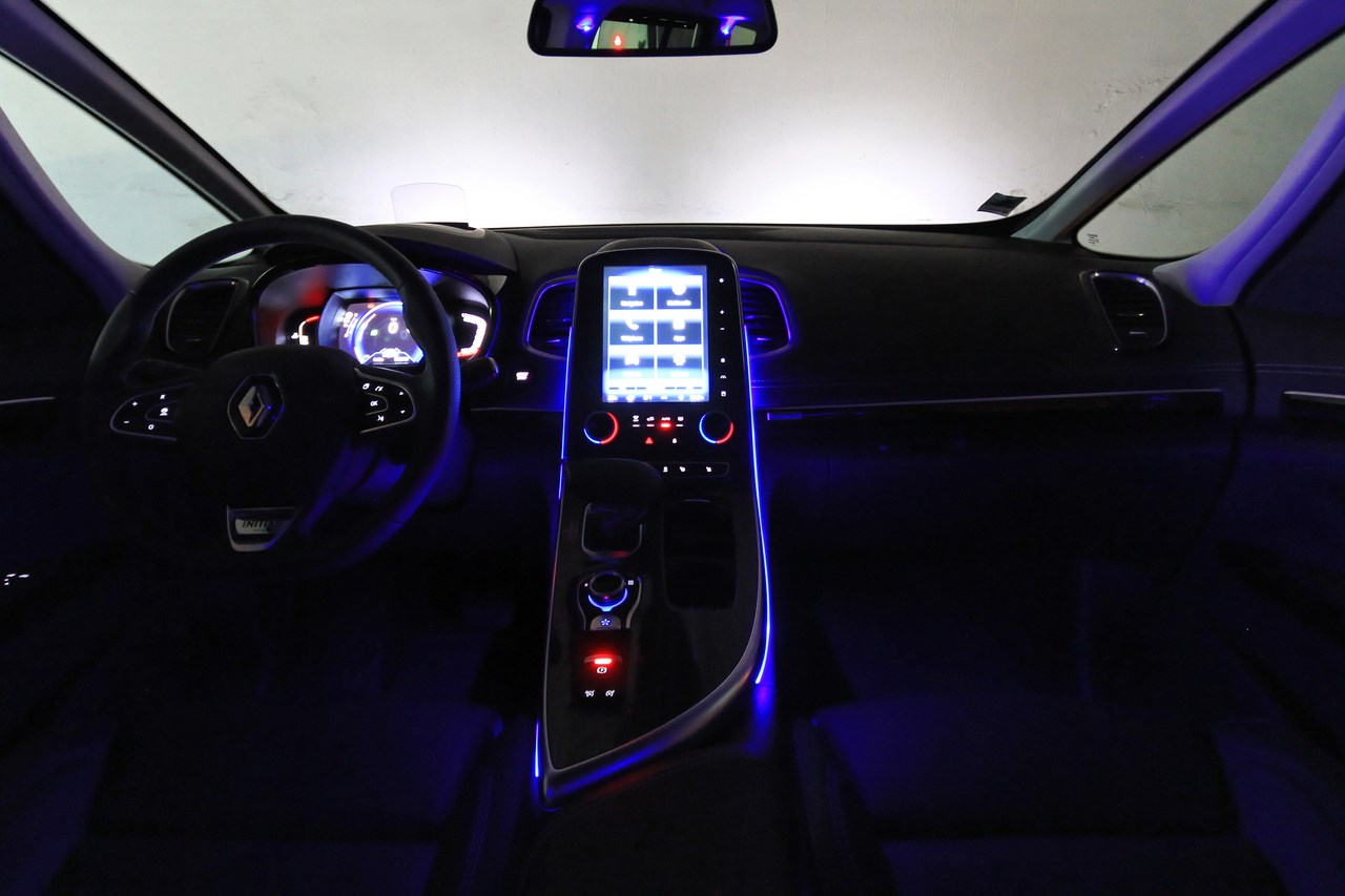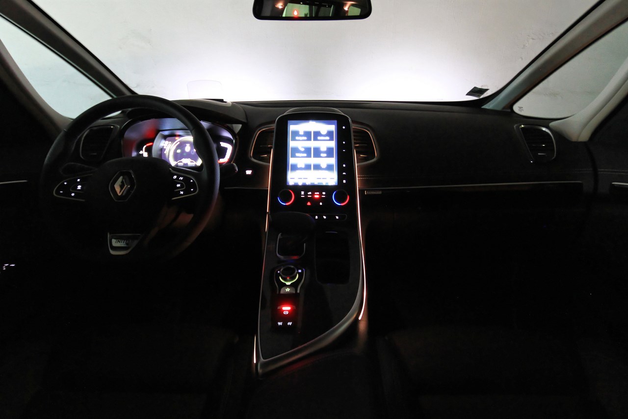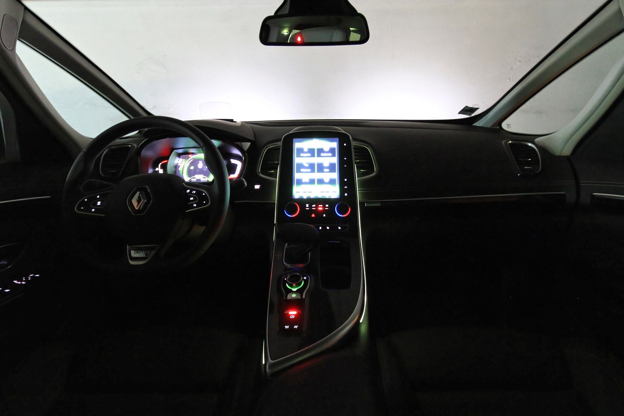 A l’approche de la voiture et après la détection de la carte clé, l’Espace 5 accueille ses passagers par l’illumination des feux de jour (Day Running light), des feux arrière et le déploiement des rétroviseurs. En parallèle, l’habitacle s’illumine avec l’une des cinq ambiances lumineuses qui parcourent la console centrale et la planche de bord. L’écran R-Link 2 dessine une esquisse de Renault Espace et le clignotement du Multi-sense renseigne sur le mode de conduite sélectionné (un battement rapide pour le mode sport, un battement doux pour le mode confort). L’accès à l’habitacle est facilité par le siège conducteur qui recule lorsque l’on quitte le véhicule, puis reprend sa position (celle programmé précédemment) lorsque le bouton de démarrage est actionné. Une fois confortablement installé, on trouve facilement sa position de conduite grâce aux nombreux réglages des sièges électriques chauffants et massants. Ces réglages s’effectuent via des boutons placés sur les côtés des assises et sont sauvegardés depuis l’écran de la tablette (mémorise jusqu’à 6 profils). Confortables et enveloppants, ils offrent une vision sur une planche de bord moussée avec surpiqûres, agrémentée d’une large console centrale biseautée qui recouvre un vaste rangement.