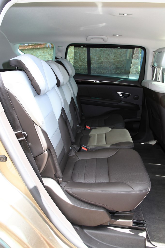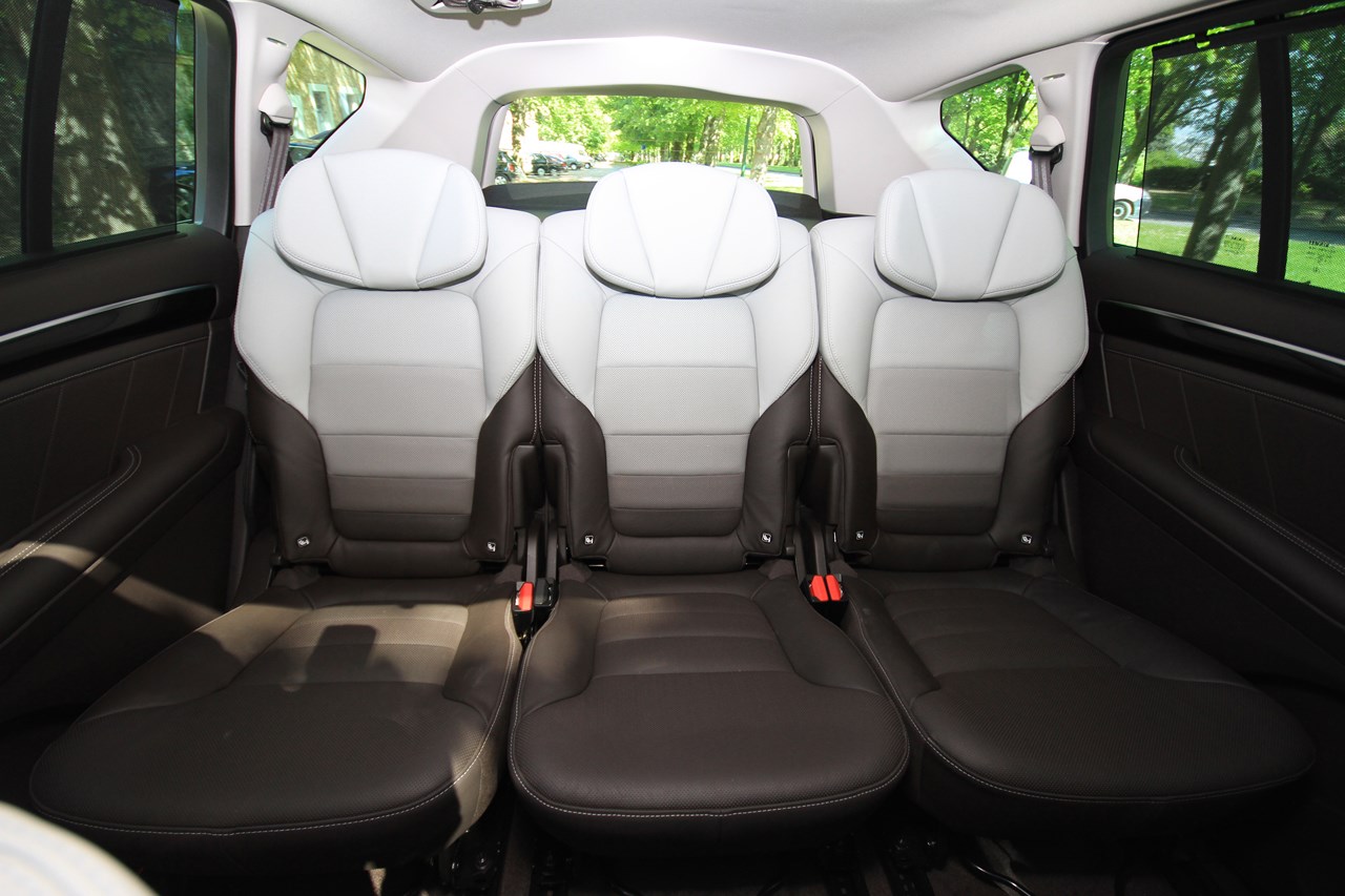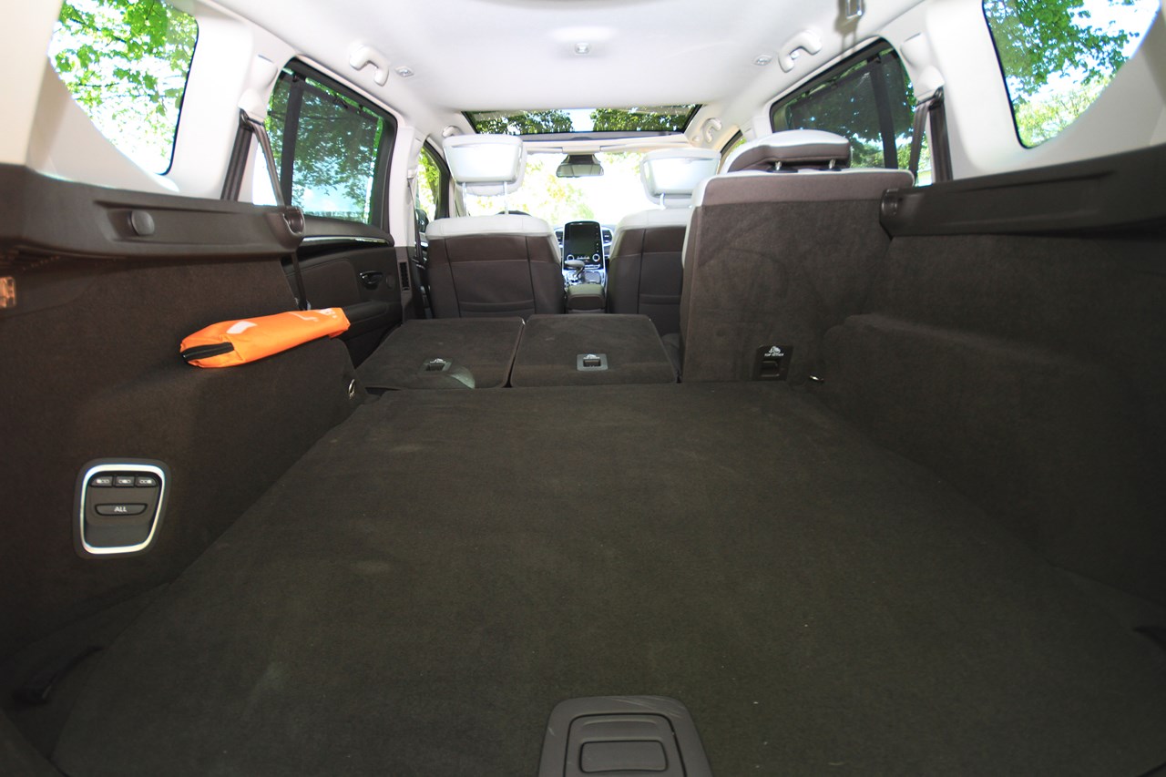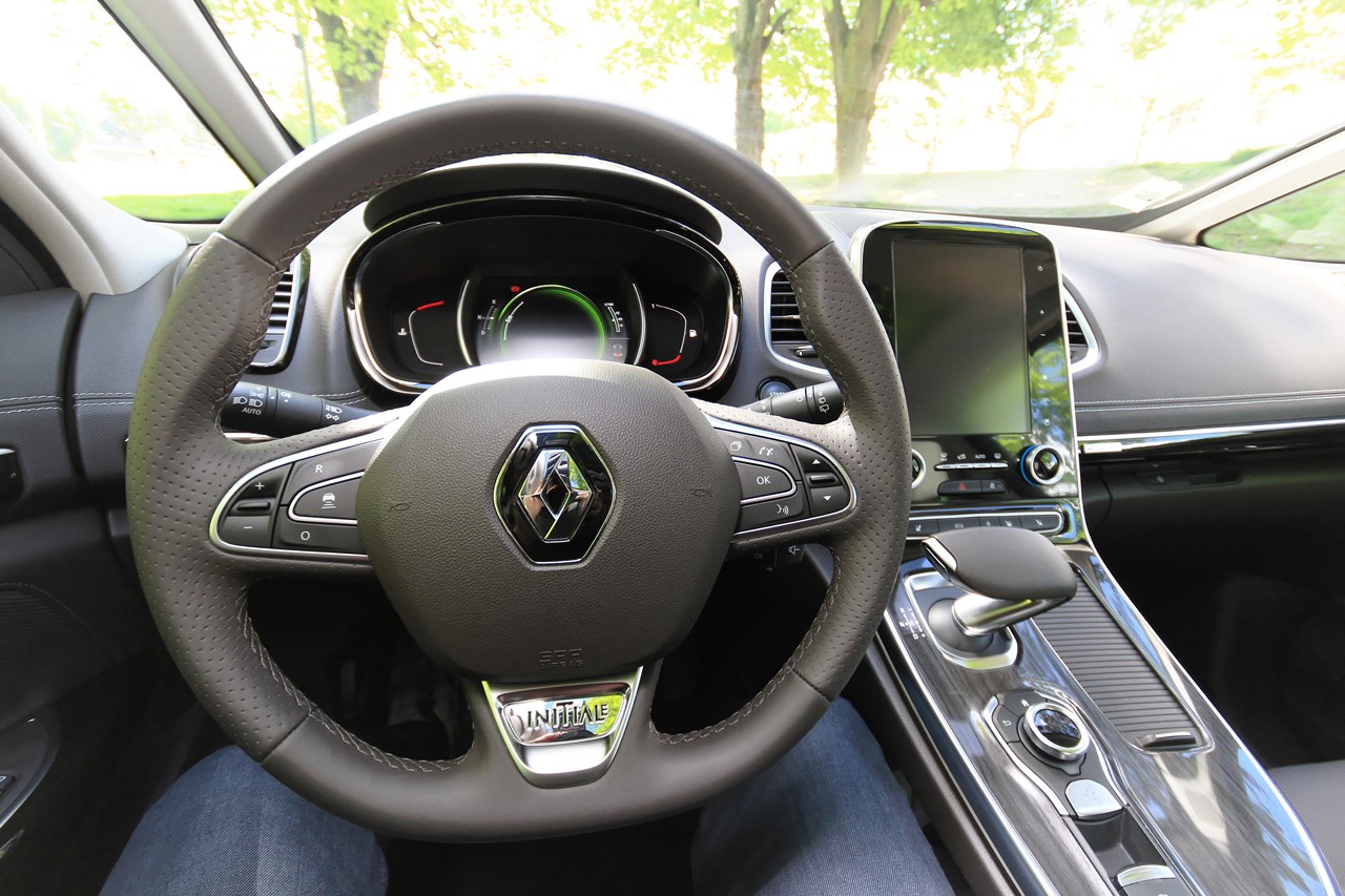L’Initiale Paris est doté du plus haut niveau de finition. L’habitacle de notre Espace est tendu d’un cuir nappa pleine fleur (gris lune/Brun foncé) qui recouvre les sièges et les contre-portes. Ce raffinement se retrouve aussi à l’arrière avec des sièges escamotables et coulissants (sur 4 cm), équipés de la “Modularité One Touch”. Cet équipement permet de faire l’impasse sur les contraignants sièges démontables des générations précédentes et permet, selon les versions (5 où 7 places), de rabattre individuellement ou ensemble les sièges dans le plancher. Cette action s’opère depuis le poste de conduite (sur l’écran tactile de la tablette) ou, depuis le compartiment à bagages via une commande dédiée. Seul point négatif de cette dotation, en configuration deux places, l’intégration des sièges dans le plancher réduit la capacité du coffre à 2101 l en version cinq places et 2035 l en sept places. Avec près d’un mètre perdu par rapport au grand Espace 4 (3000 l), l’Espace 5 est incontestablement moins logeable.