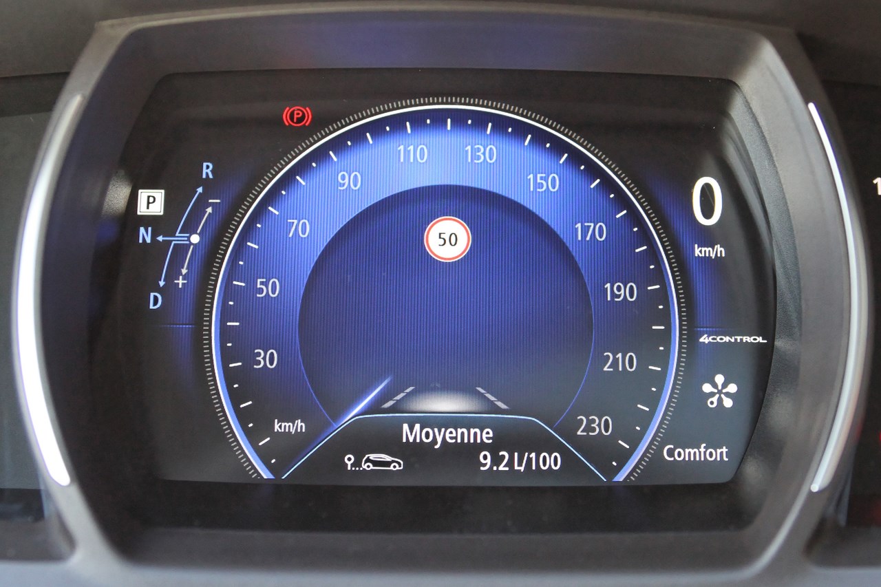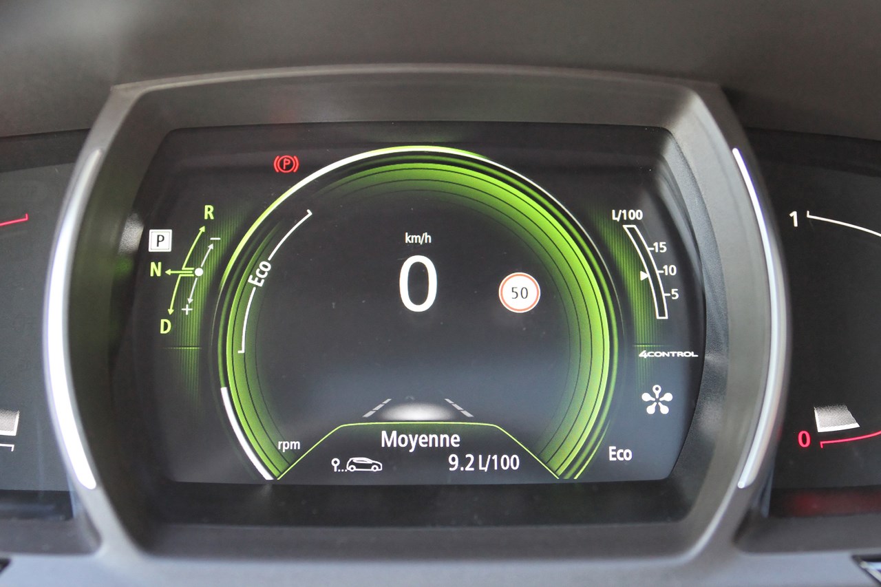 Dès les premiers mètres l’Espace 5 surprend. Le moteur est silencieux et la boite de vitesse EDC à double embrayage travaille sans à-coups lors de l’enchaînement des 7 rapports. Si elle n’atteint pas le niveau d’une boite DSG (patinage et réactivité), son maniement est d’une grande douceur avec son levier type “Boeing” qui demande une certaine accoutumance pour enclencher les modes Drive, Return et Neutre. Cette boite propose un mode sport qui interagit sur la réponse de l’accélérateur, la suspension, la dureté de la direction et la sonorité du moteur. Une des grandes qualités de l’Espace 5 réside dans sa direction qui facilite les manœuvres en ville. A la fois douce et précise, son système “4Control” réduit le rayon de braquage et efface le gabarit de l’Espace. Il est aisé de se faufiler dans la circulation, la garde au sol rehaussée permettant une bonne visibilité vers l’avant. Si l’Espace 5 fait office de ballerine en ville, la réactivité de sa direction et le dynamisme du châssis sont parfois déroutant lorsque que le rythme s’accélère. Très vif dans ses réactions, le châssis de l’Espace surprend son conducteur si son action au volant n’est pas modérée. Une fois le mode d’emploi assimilé, la tenue de route est sécurisante au point de se croire au volant d’une sportive. Bluffant ! Pourtant, tout n’est pas parfait et l’évolution sur le réseau secondaire fait ressortir les défauts de l’Espace 5. Et cela commence par le train avant qui a du mal à contenir la puissance du moteur en sortie de courbe ou dans un rond-point. Sous l’effet du couple, les pneus (Dunlop Sport 235/55/19) perdent leur motricité et le conducteur sent le train avant tirailler de gauche à droite. Pire encore, la suspension arrière trop souple (en détente) fait pomper le train arrière et cela même lorsque le mode Sport est activé. Si cette sensation persiste sur autoroute, ce terrain reste le domaine de prédilection de l’Espace 5. En conjuguant confort et sonorité maitrisée, les kilomètres sont effacés au point de s’ennuyer au volant lorsque le régulateur de vitesse adaptif est activé. En cas de besoin, la souplesse du moteur permet de bonnes reprises, n’incitant pas le conducteur à jouer avec la boite de vitesse. Cette souplesse est bénéfique à la consommation et à l’autonomie. La consommation moyenne s’étant stabilisée à 9,2 L/100km sur un parcours mixte (ville, départementale, autoroute). Avec un réservoir de 58 litres, l’autonomie ne dépasse pas les 550 km. Mais une nouvelle fois c’est le comportement routier qui surprend. Imperturbable, sa tenue de cap est parfaite et le système “4Control” (qui fait pivoter le train arrière dans le même sens que les roues avant), permet d’aborder les grandes courbes avec sérénité. Les vitesses de passage sont tout simplement ahurissante et le roulis bien maîtrisé. Durant l’essai le freinage, assuré par quatre disques, n’a fait l’objet d’aucune critique avec un ABS discret.