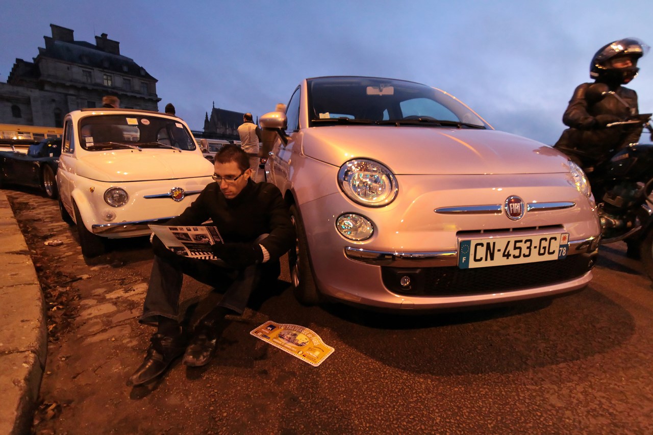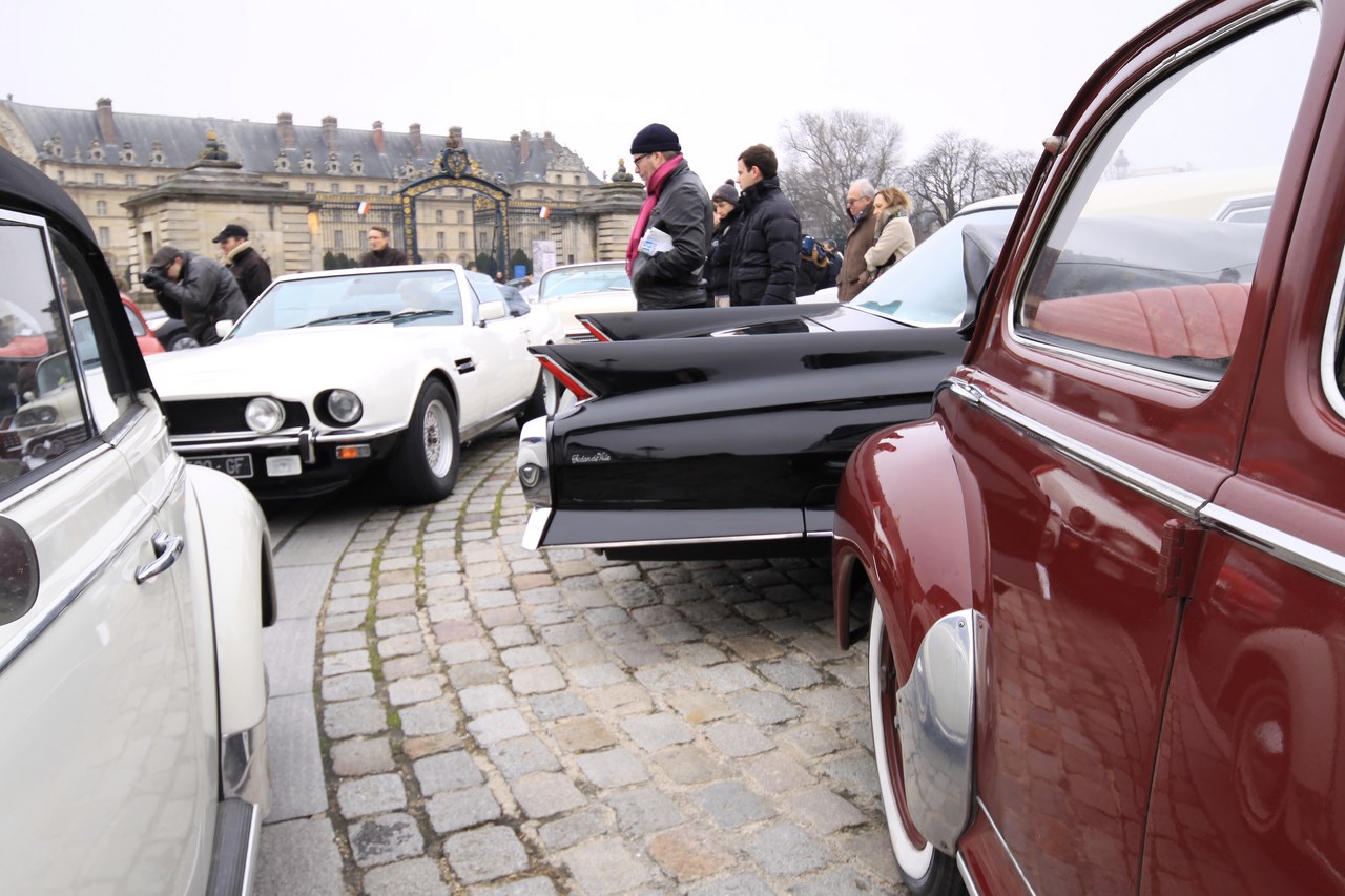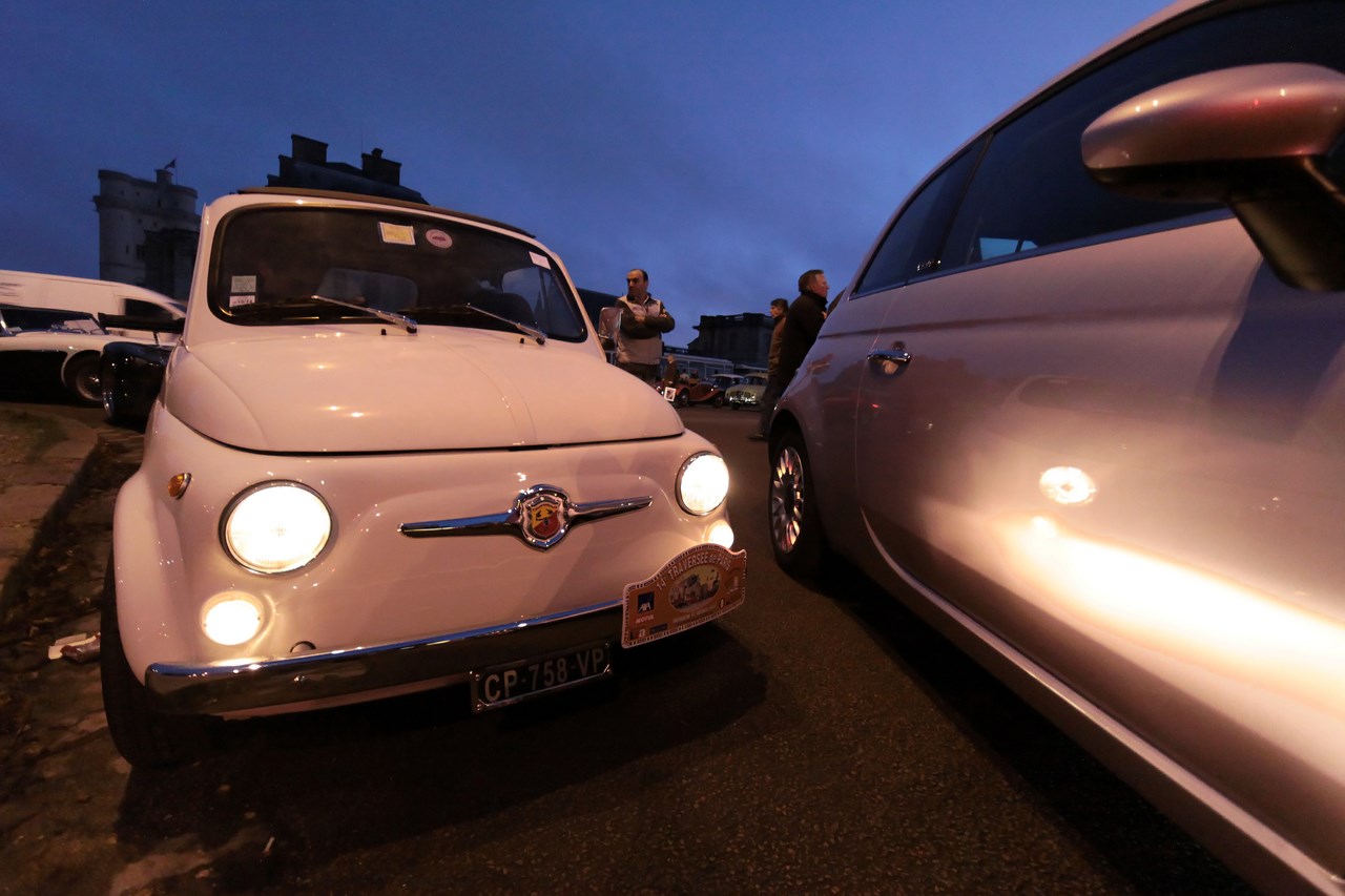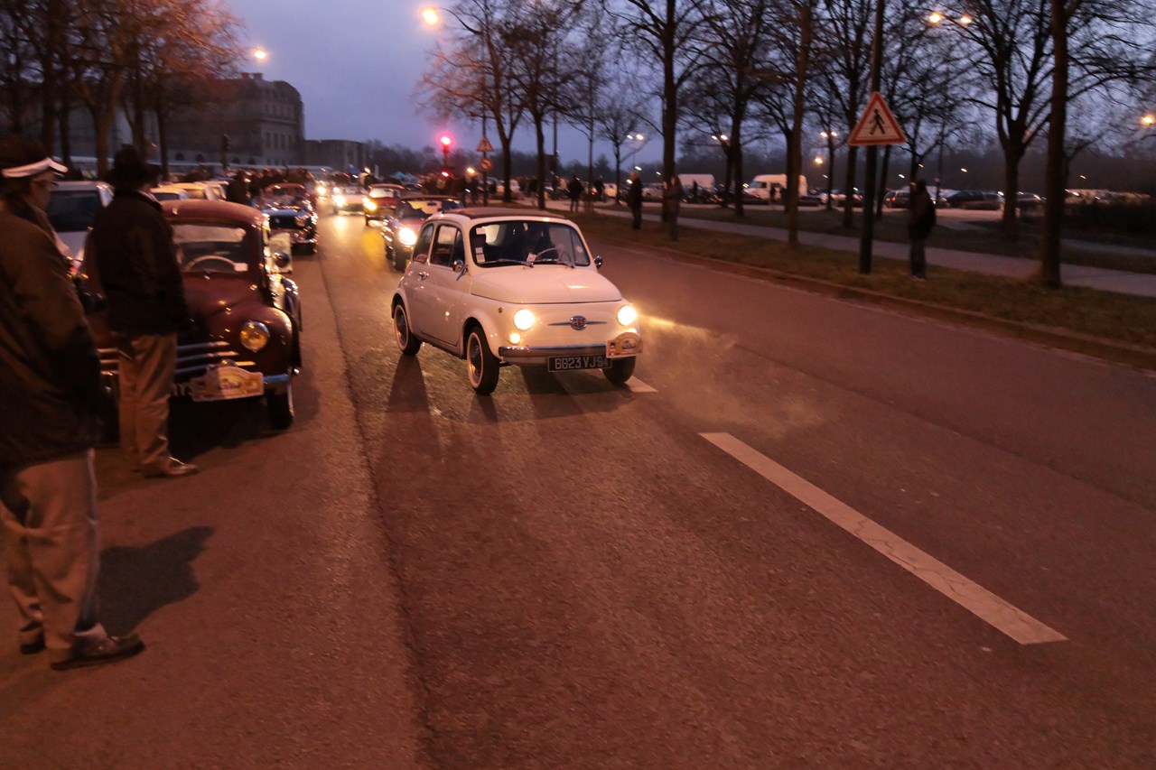 C’est au Château de Vincennes et dans un froid glacial que nous retrouvons les 600 voitures et 40 motos inscrites. Venus pour s’approprier les rues de la capitale le temps d’une matinée, ils transforment l’esplanade du Château en parking géant. Si mon copilote (P.E) et moi même assumons notre choix d’y participer en voiture moderne, cette démarche reste un sacrilège pour les propriétaires d’anciennes. Alors que nous tentons une arrivée discrète, le clin d’œil au passé et la teinte « Idol Pink » de notre 500C attire la sympathie des participants. Je tiens à ce sujet à remercier les designers d’avoir inventé le style néo-rétro qui nous évite de passer la journée au fond d’un cachot obscure du Château.