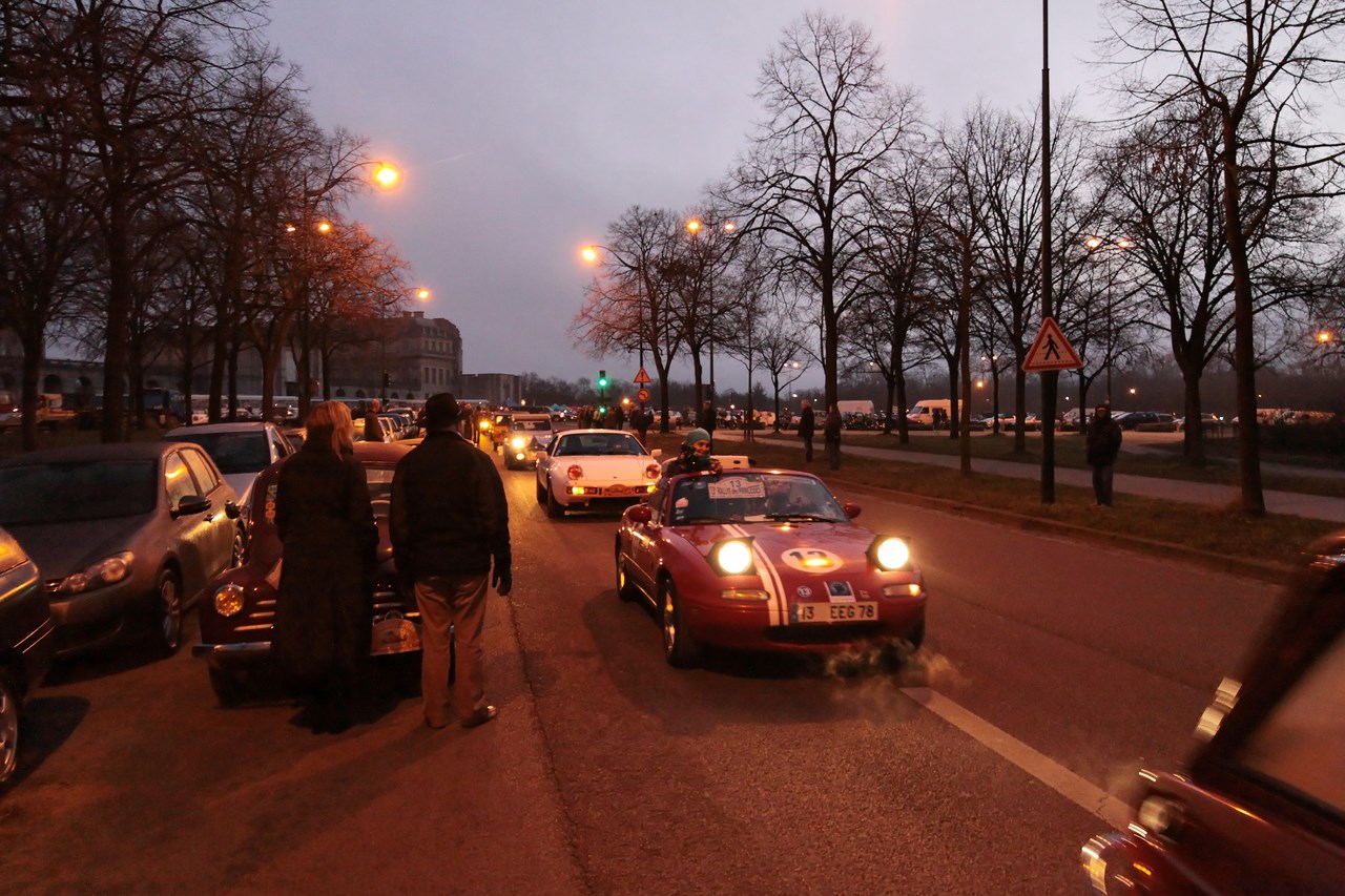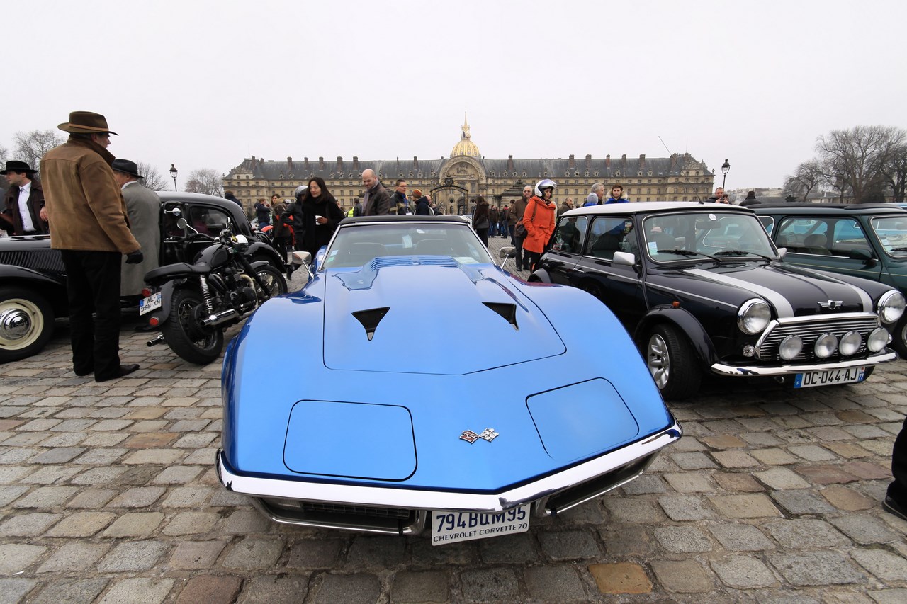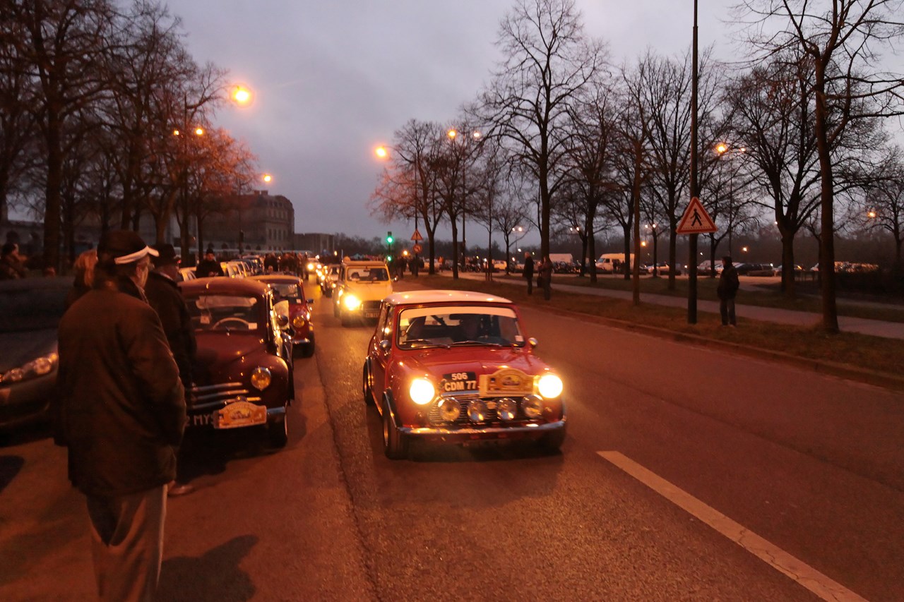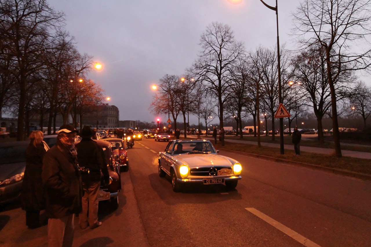 C’est au Château de Vincennes et dans un froid glacial que nous retrouvons les 600 voitures et 40 motos inscrites. Venus pour s’approprier les rues de la capitale le temps d’une matinée, ils transforment l’esplanade du Château en parking géant. Si mon copilote (P.E) et moi même assumons notre choix d’y participer en voiture moderne, cette démarche reste un sacrilège pour les propriétaires d’anciennes. Alors que nous tentons une arrivée discrète, le clin d’œil au passé et la teinte « Idol Pink » de notre 500C attire la sympathie des participants. Je tiens à ce sujet à remercier les designers d’avoir inventé le style néo-rétro qui nous évite de passer la journée au fond d’un cachot obscure du Château.