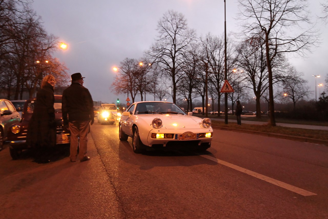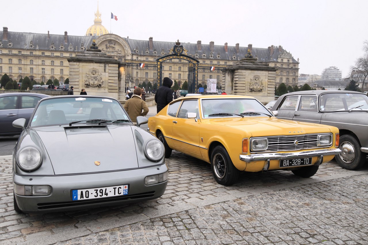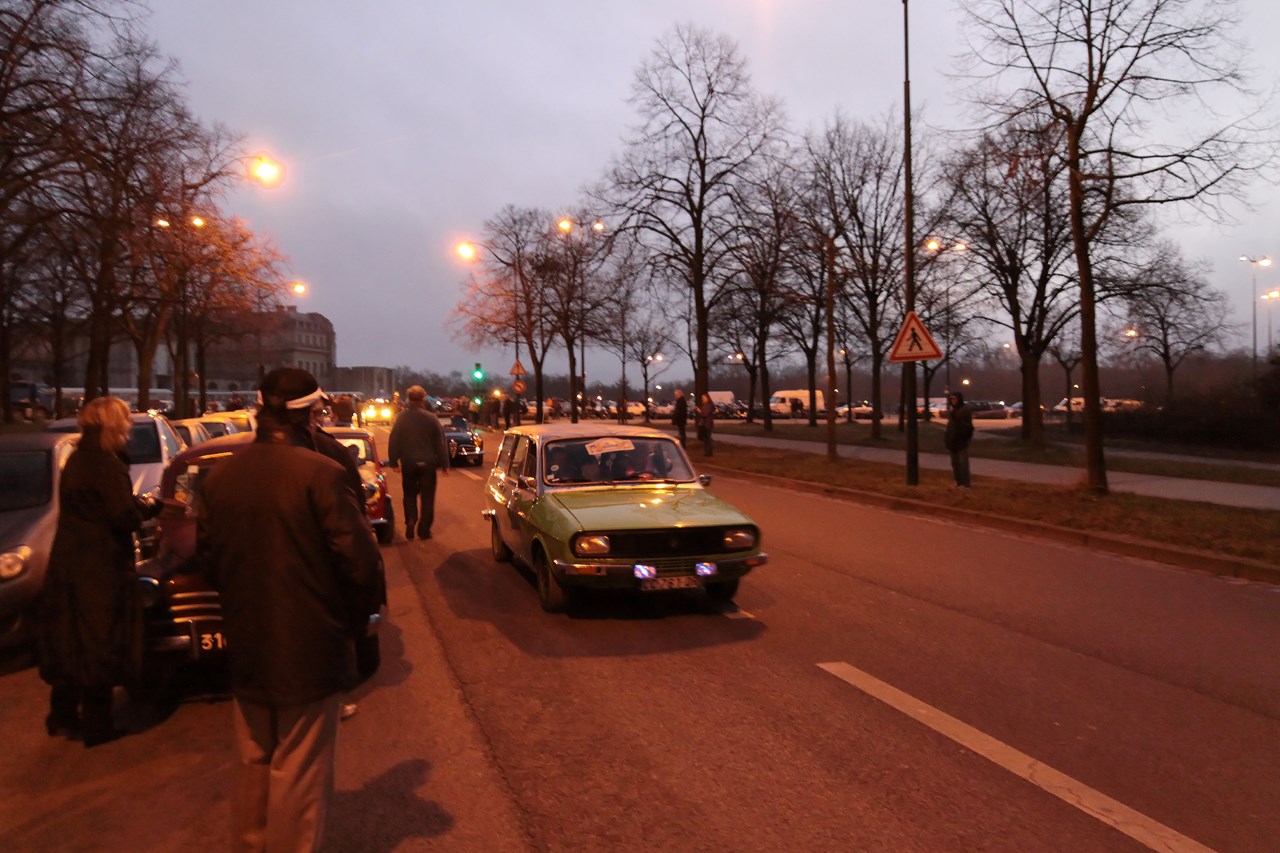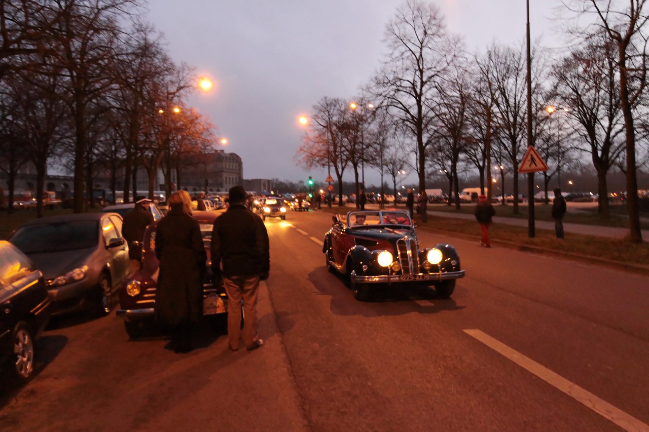 C’est au Château de Vincennes et dans un froid glacial que nous retrouvons les 600 voitures et 40 motos inscrites. Venus pour s’approprier les rues de la capitale le temps d’une matinée, ils transforment l’esplanade du Château en parking géant. Si mon copilote (P.E) et moi même assumons notre choix d’y participer en voiture moderne, cette démarche reste un sacrilège pour les propriétaires d’anciennes. Alors que nous tentons une arrivée discrète, le clin d’œil au passé et la teinte « Idol Pink » de notre 500C attire la sympathie des participants. Je tiens à ce sujet à remercier les designers d’avoir inventé le style néo-rétro qui nous évite de passer la journée au fond d’un cachot obscure du Château.