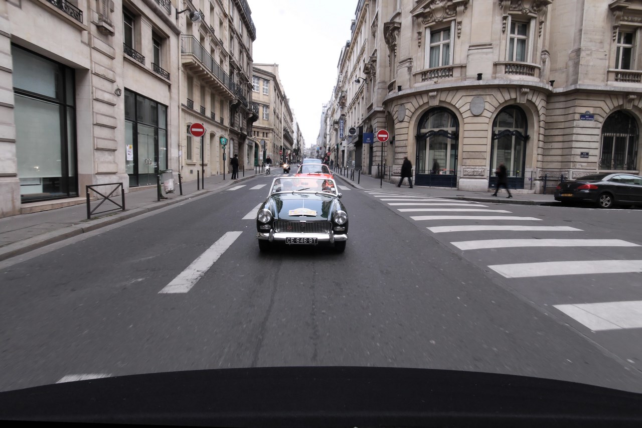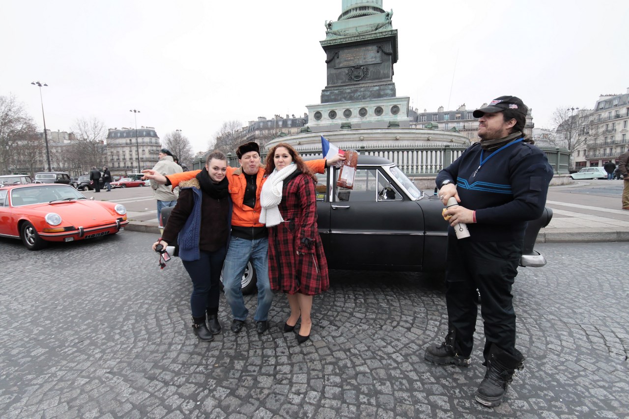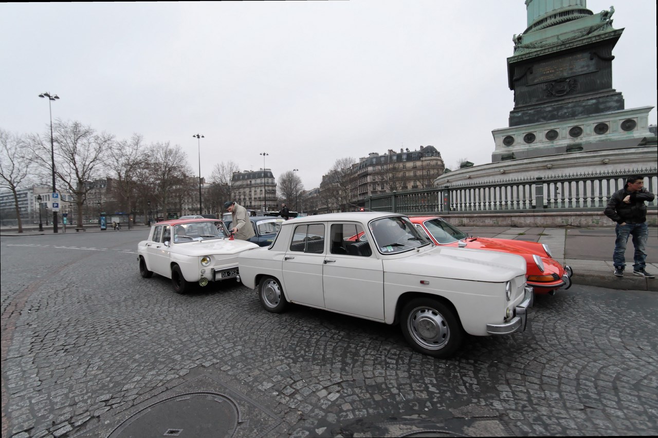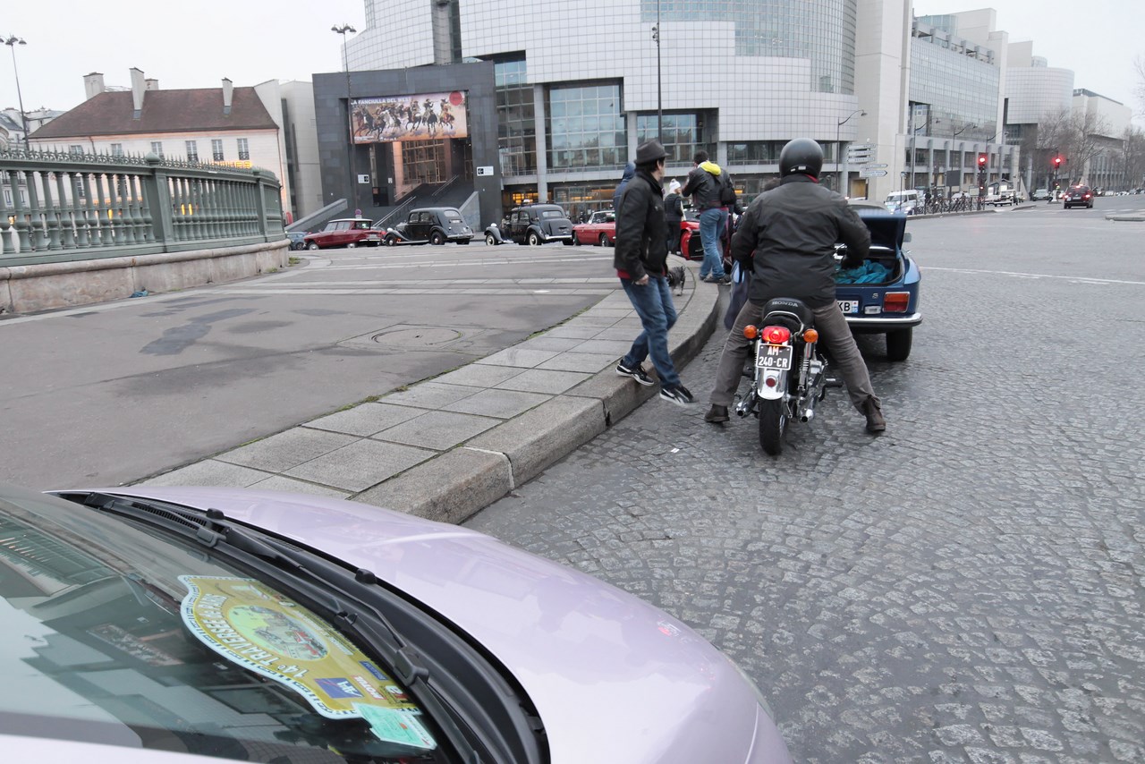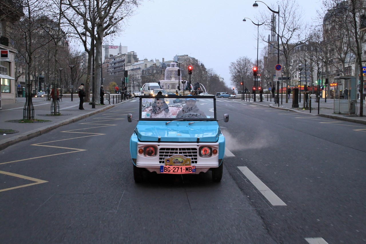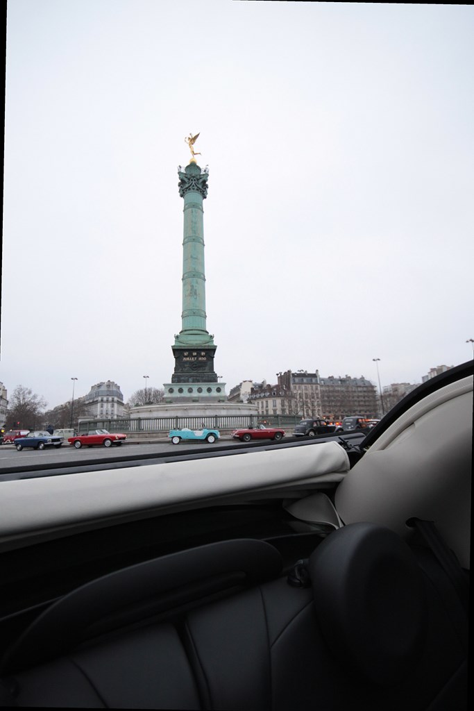 C’est sous l’escorte d’une VW Coccinelle et d’une Méhari que nous franchissons les boulevards des Maréchaux qui séparent Vincennes de Paris. Notre roadbook nous mène jusqu’à la place Félix Eboué, lieu des premières spots photographiques. Alors qu’une anglaise stationne sur le long du trottoir capot ouvert, nous poursuivons notre chemin sur l’avenue Daumesnil jusqu’à la Bastille. Durant ce tronçon nous dépassons une Jeep Willys battant pavillon américain, une Méhari bi-ton et deux Renault Estafette. L’arrêt à un feu rouge nous offre quelques palpitations quand une odeur d’huile et d’essence brûlées envahissent l’habitacle en cuir de notre voiture. Alors que « P.E » et moi même échangeons un regard inquiet, la présence de trois solex et d’une Sanford (voiture à 3 roues) nous rassure sur l’origine des ces émanations. Fin de l’alerte ! Avant de repartir, j’observe l’accoutrement du pilote de la Sanford et prend conscience du confort qu’offre le chauffage de notre voiture que j’ai qualifié de « faiblard » quelques kilomètres auparavant. Enfant gâté que je suis…
