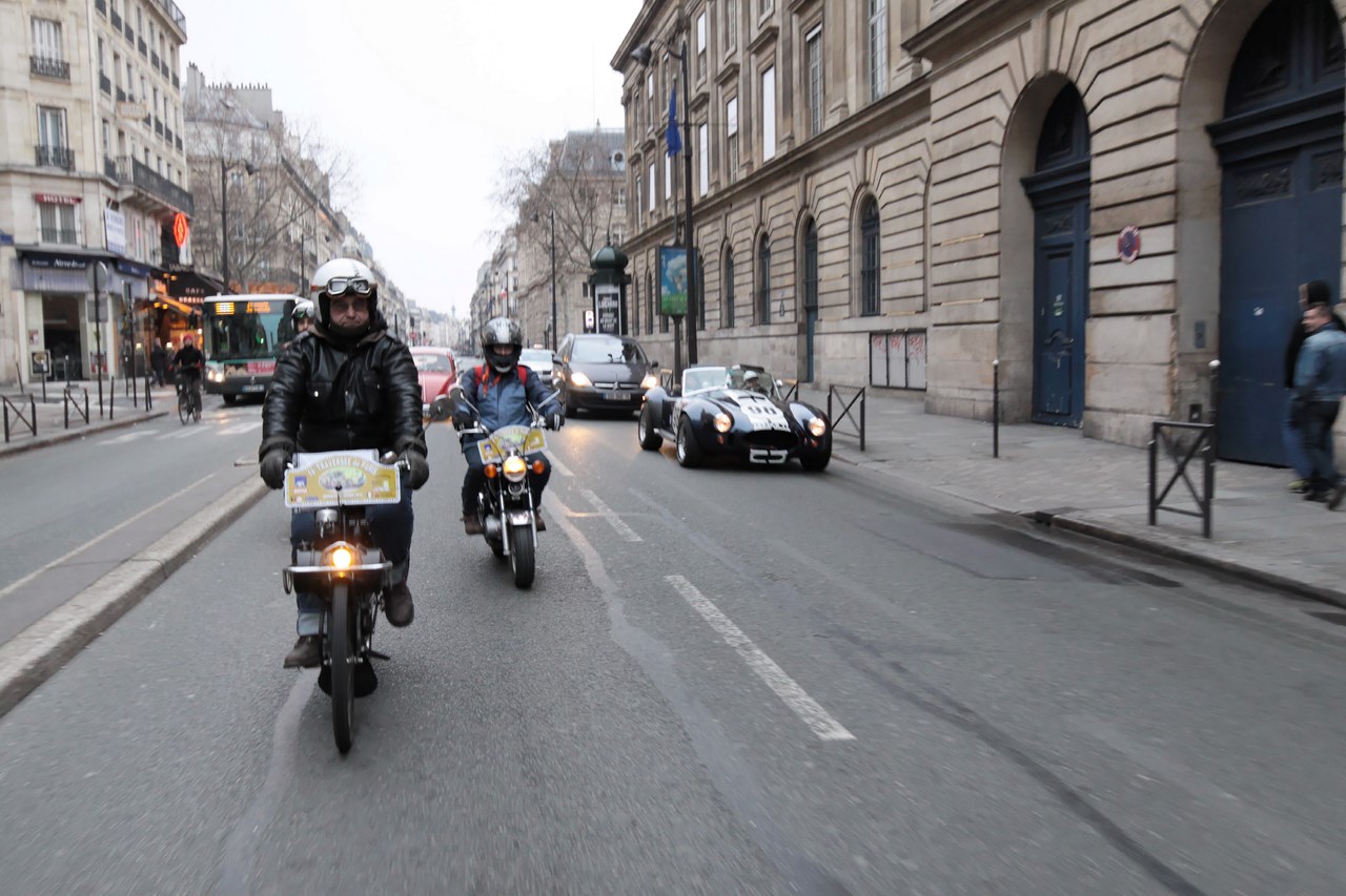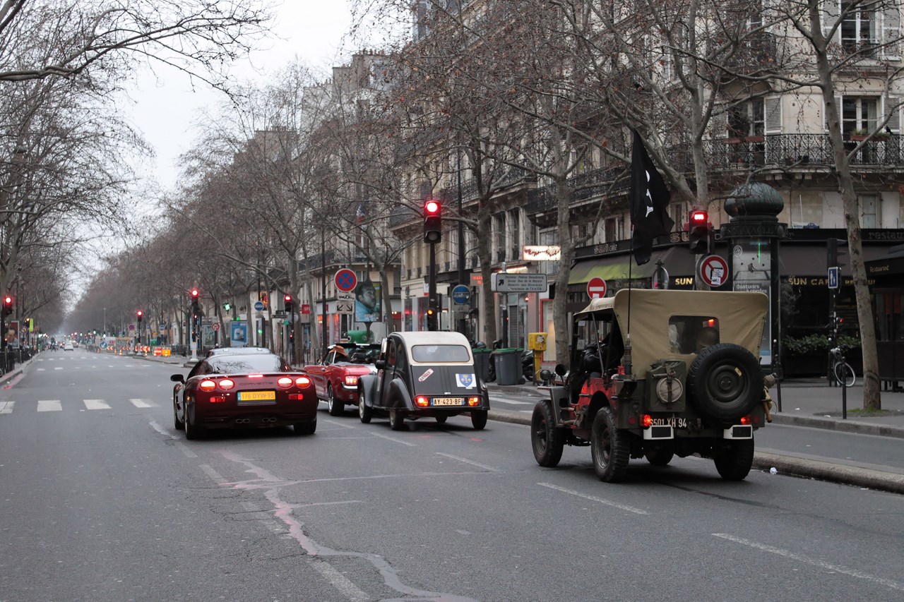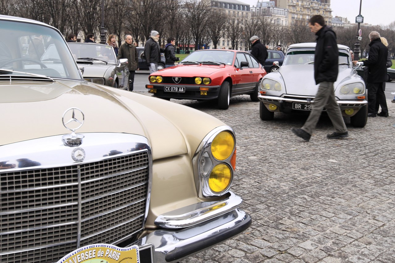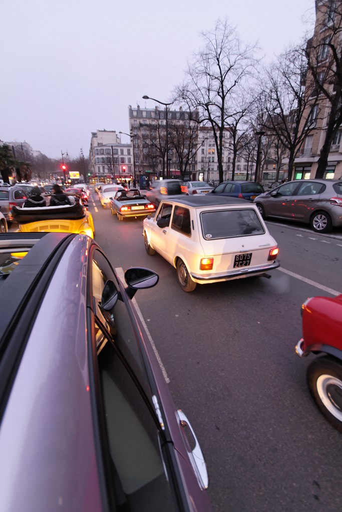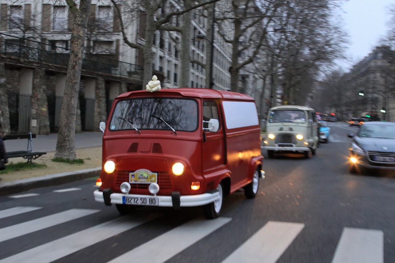 C’est sous l’escorte d’une VW Coccinelle et d’une Méhari que nous franchissons les boulevards des Maréchaux qui séparent Vincennes de Paris. Notre roadbook nous mène jusqu’à la place Félix Eboué, lieu des premières spots photographiques. Alors qu’une anglaise stationne sur le long du trottoir capot ouvert, nous poursuivons notre chemin sur l’avenue Daumesnil jusqu’à la Bastille. Durant ce tronçon nous dépassons une Jeep Willys battant pavillon américain, une Méhari bi-ton et deux Renault Estafette. L’arrêt à un feu rouge nous offre quelques palpitations quand une odeur d’huile et d’essence brûlées envahissent l’habitacle en cuir de notre voiture. Alors que « P.E » et moi même échangeons un regard inquiet, la présence de trois solex et d’une Sanford (voiture à 3 roues) nous rassure sur l’origine des ces émanations. Fin de l’alerte ! Avant de repartir, j’observe l’accoutrement du pilote de la Sanford et prend conscience du confort qu’offre le chauffage de notre voiture que j’ai qualifié de « faiblard » quelques kilomètres auparavant. Enfant gâté que je suis…