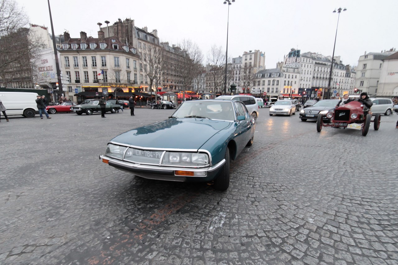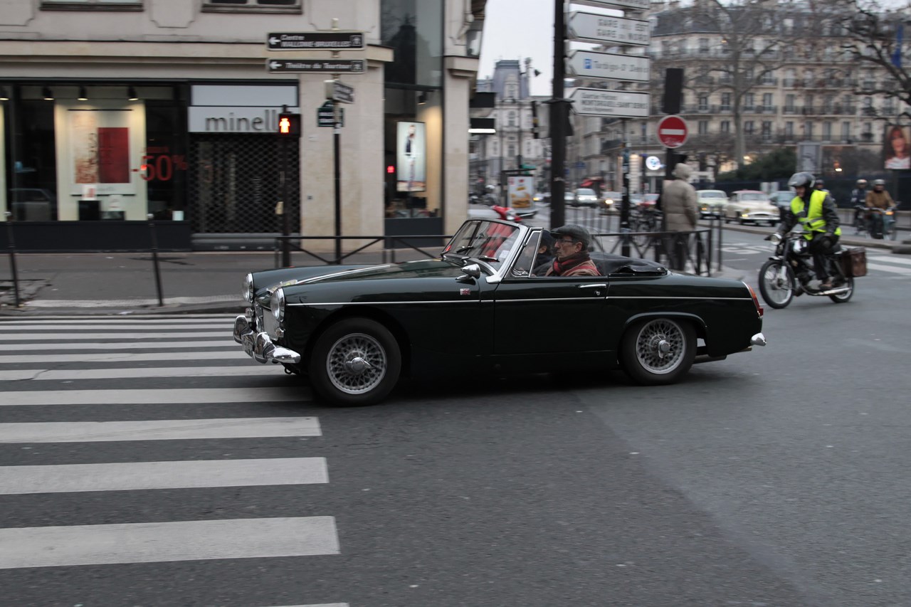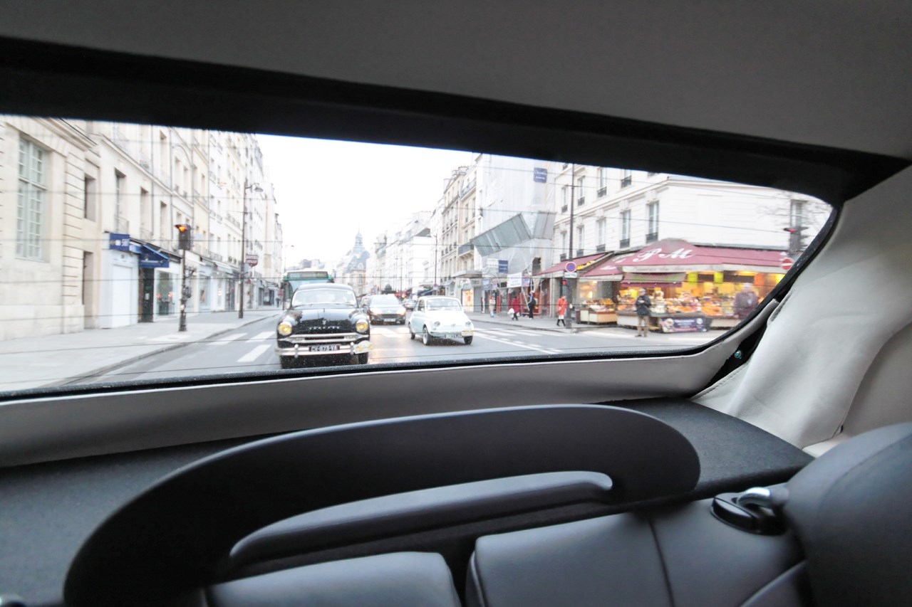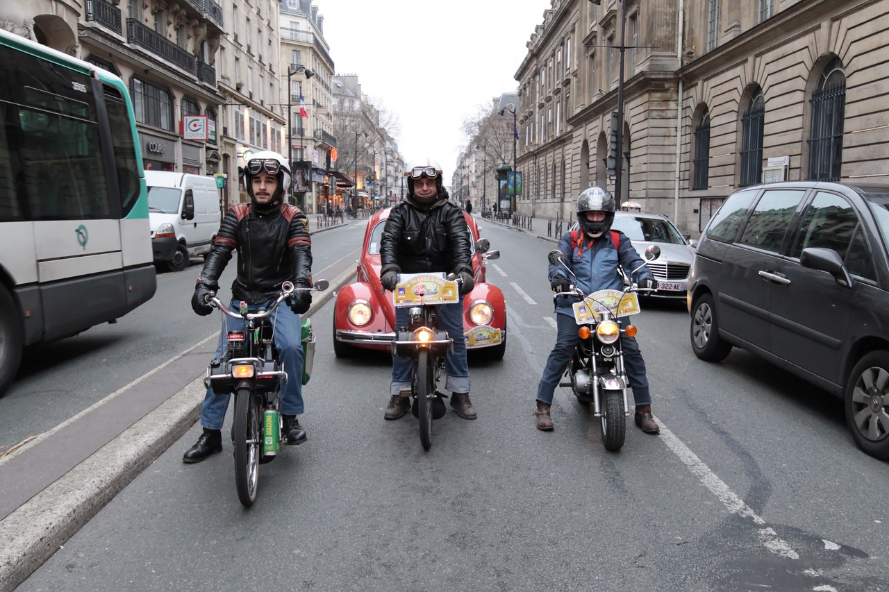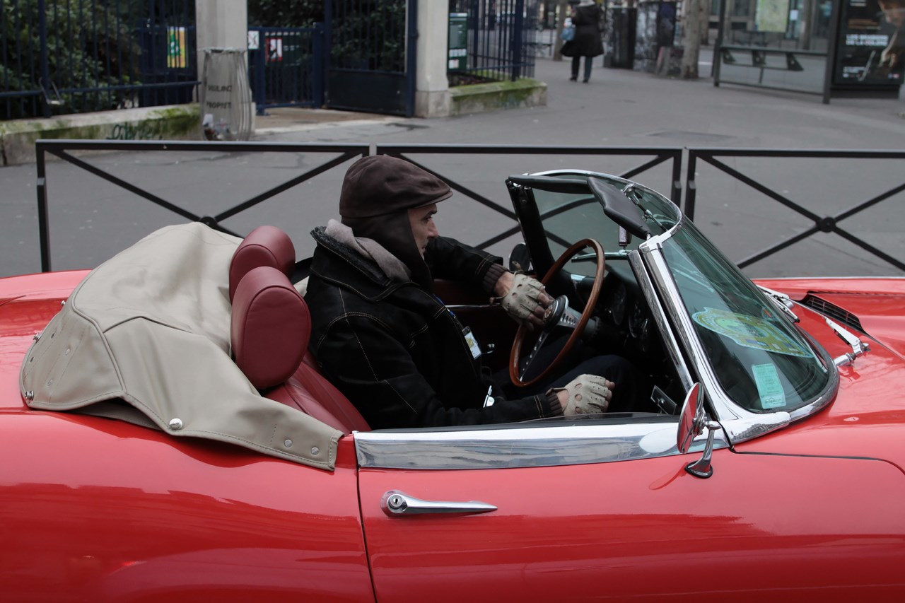 C’est sous l’escorte d’une VW Coccinelle et d’une Méhari que nous franchissons les boulevards des Maréchaux qui séparent Vincennes de Paris. Notre roadbook nous mène jusqu’à la place Félix Eboué, lieu des premières spots photographiques. Alors qu’une anglaise stationne sur le long du trottoir capot ouvert, nous poursuivons notre chemin sur l’avenue Daumesnil jusqu’à la Bastille. Durant ce tronçon nous dépassons une Jeep Willys battant pavillon américain, une Méhari bi-ton et deux Renault Estafette. L’arrêt à un feu rouge nous offre quelques palpitations quand une odeur d’huile et d’essence brûlées envahissent l’habitacle en cuir de notre voiture. Alors que « P.E » et moi même échangeons un regard inquiet, la présence de trois solex et d’une Sanford (voiture à 3 roues) nous rassure sur l’origine des ces émanations. Fin de l’alerte ! Avant de repartir, j’observe l’accoutrement du pilote de la Sanford et prend conscience du confort qu’offre le chauffage de notre voiture que j’ai qualifié de « faiblard » quelques kilomètres auparavant. Enfant gâté que je suis…