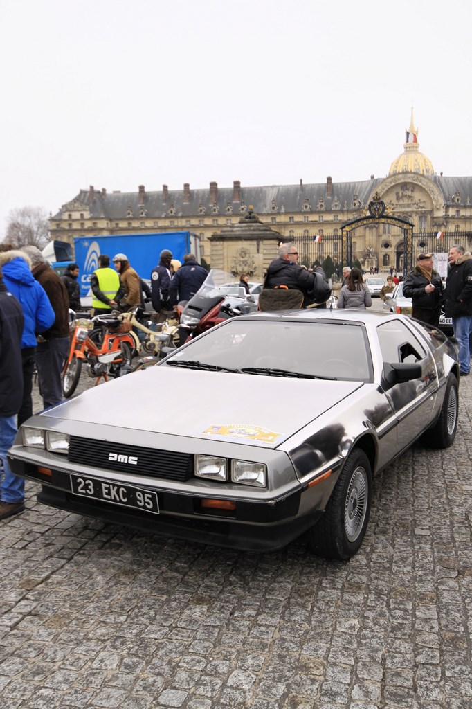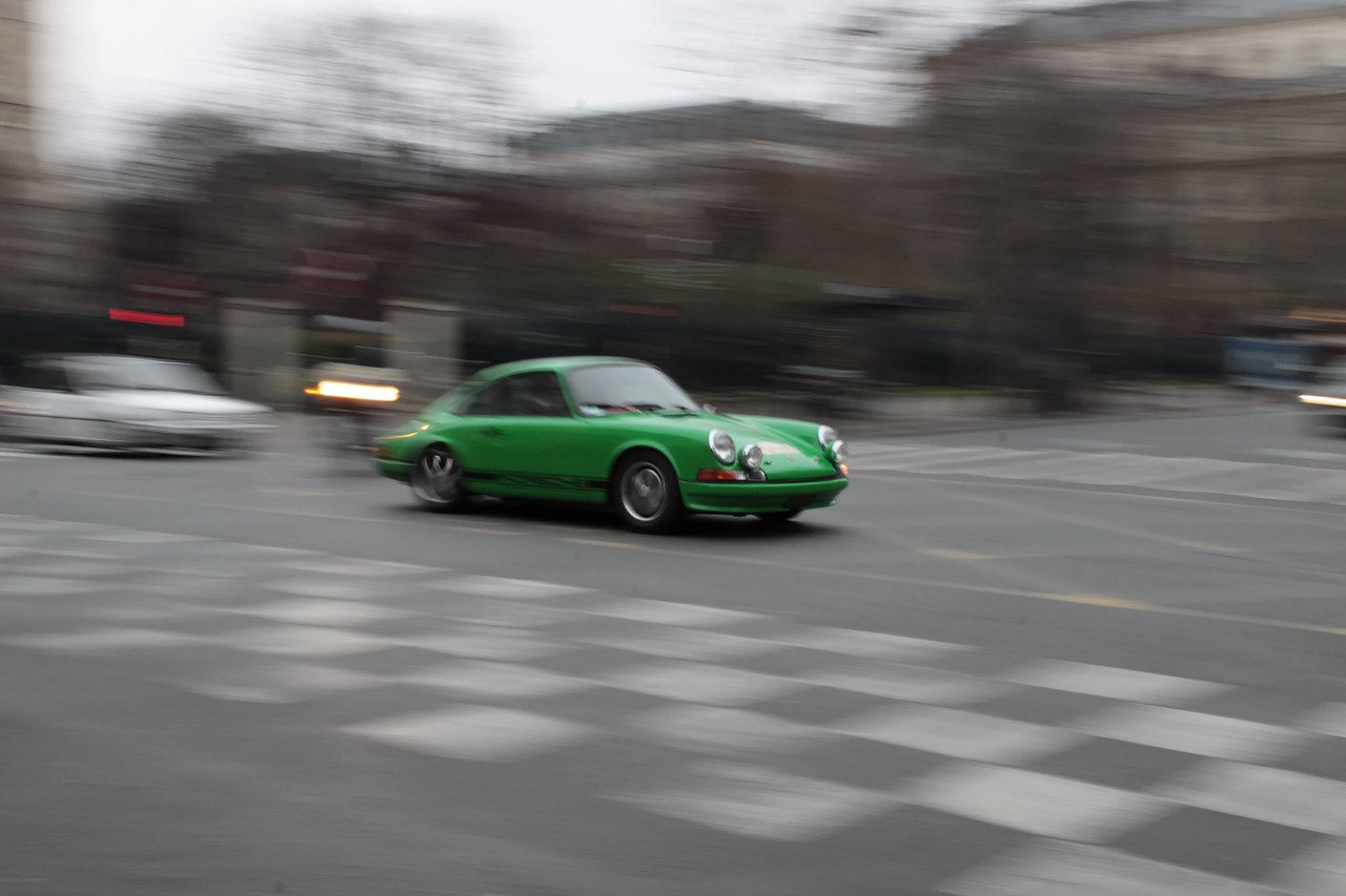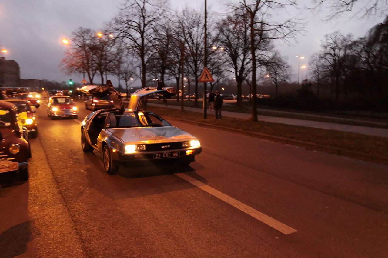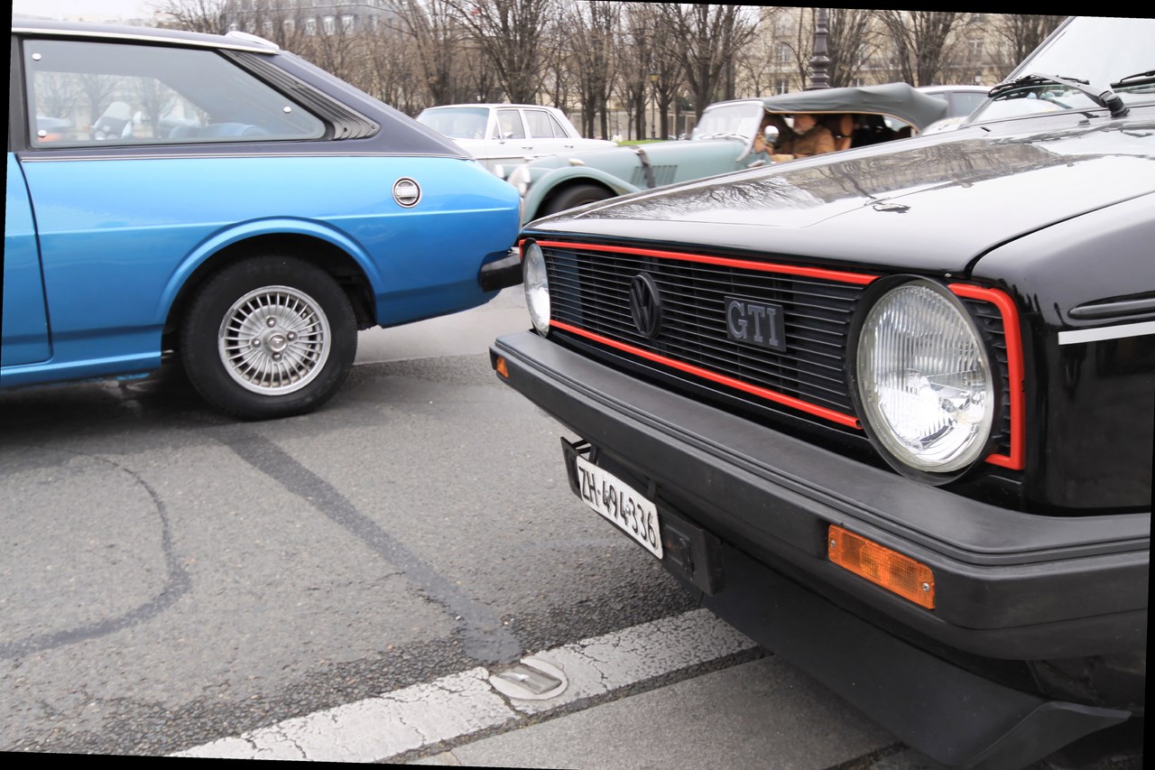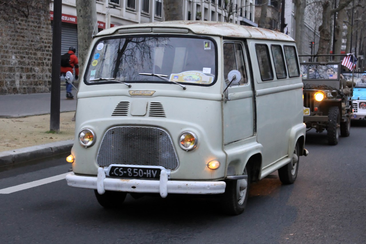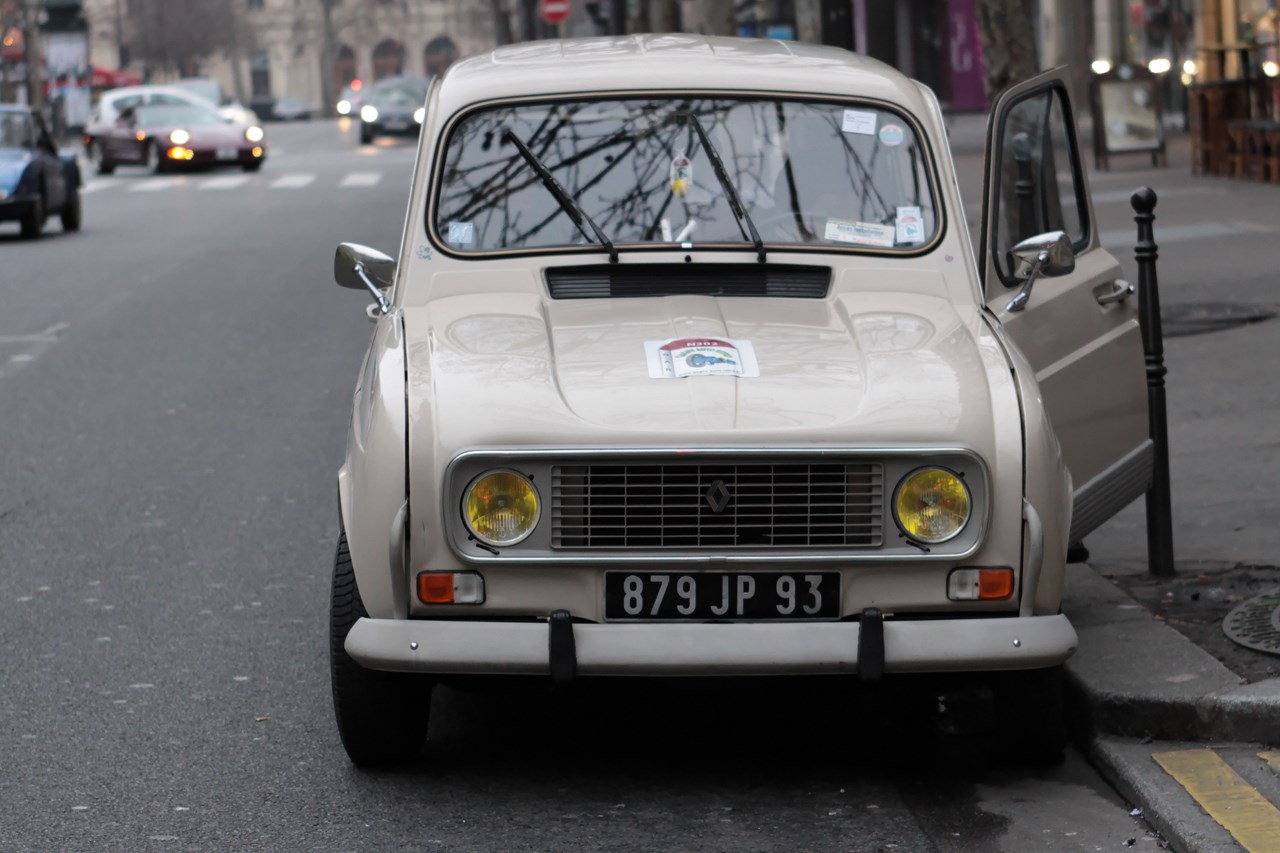 C’est sous l’escorte d’une VW Coccinelle et d’une Méhari que nous franchissons les boulevards des Maréchaux qui séparent Vincennes de Paris. Notre roadbook nous mène jusqu’à la place Félix Eboué, lieu des premières spots photographiques. Alors qu’une anglaise stationne sur le long du trottoir capot ouvert, nous poursuivons notre chemin sur l’avenue Daumesnil jusqu’à la Bastille. Durant ce tronçon nous dépassons une Jeep Willys battant pavillon américain, une Méhari bi-ton et deux Renault Estafette. L’arrêt à un feu rouge nous offre quelques palpitations quand une odeur d’huile et d’essence brûlées envahissent l’habitacle en cuir de notre voiture. Alors que « P.E » et moi même échangeons un regard inquiet, la présence de trois solex et d’une Sanford (voiture à 3 roues) nous rassure sur l’origine des ces émanations. Fin de l’alerte ! Avant de repartir, j’observe l’accoutrement du pilote de la Sanford et prend conscience du confort qu’offre le chauffage de notre voiture que j’ai qualifié de « faiblard » quelques kilomètres auparavant. Enfant gâté que je suis…