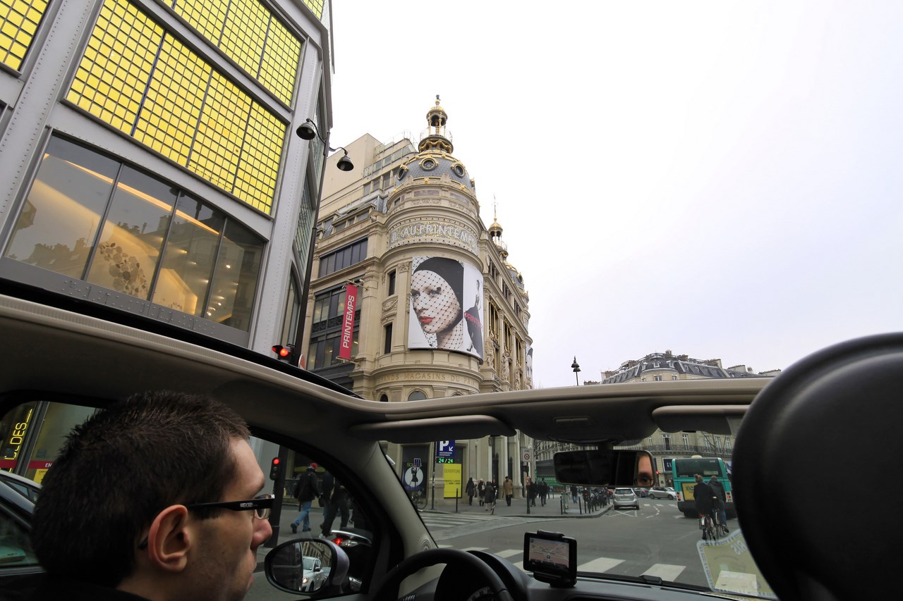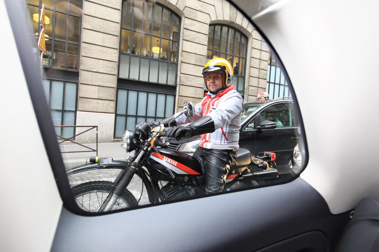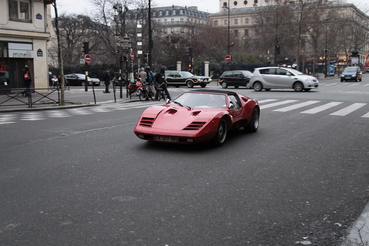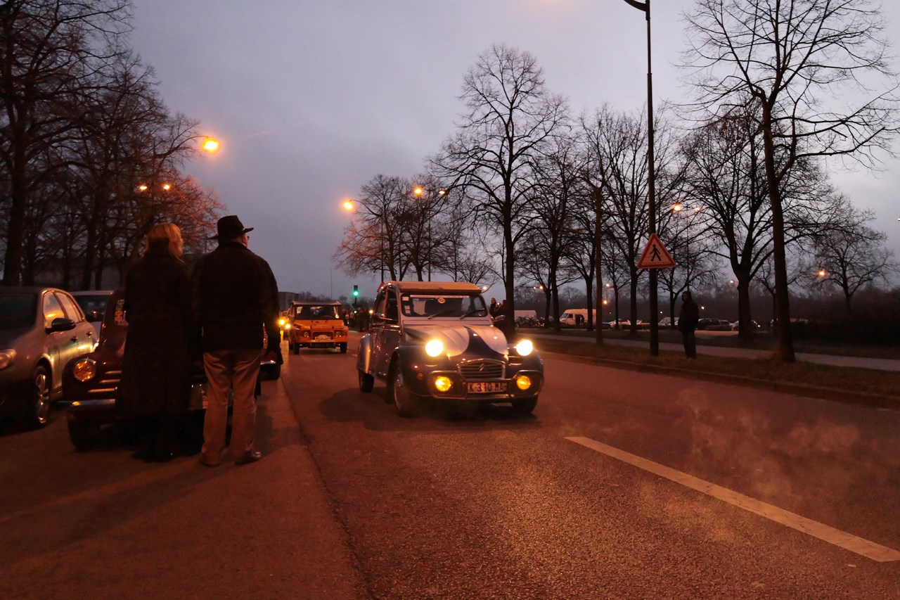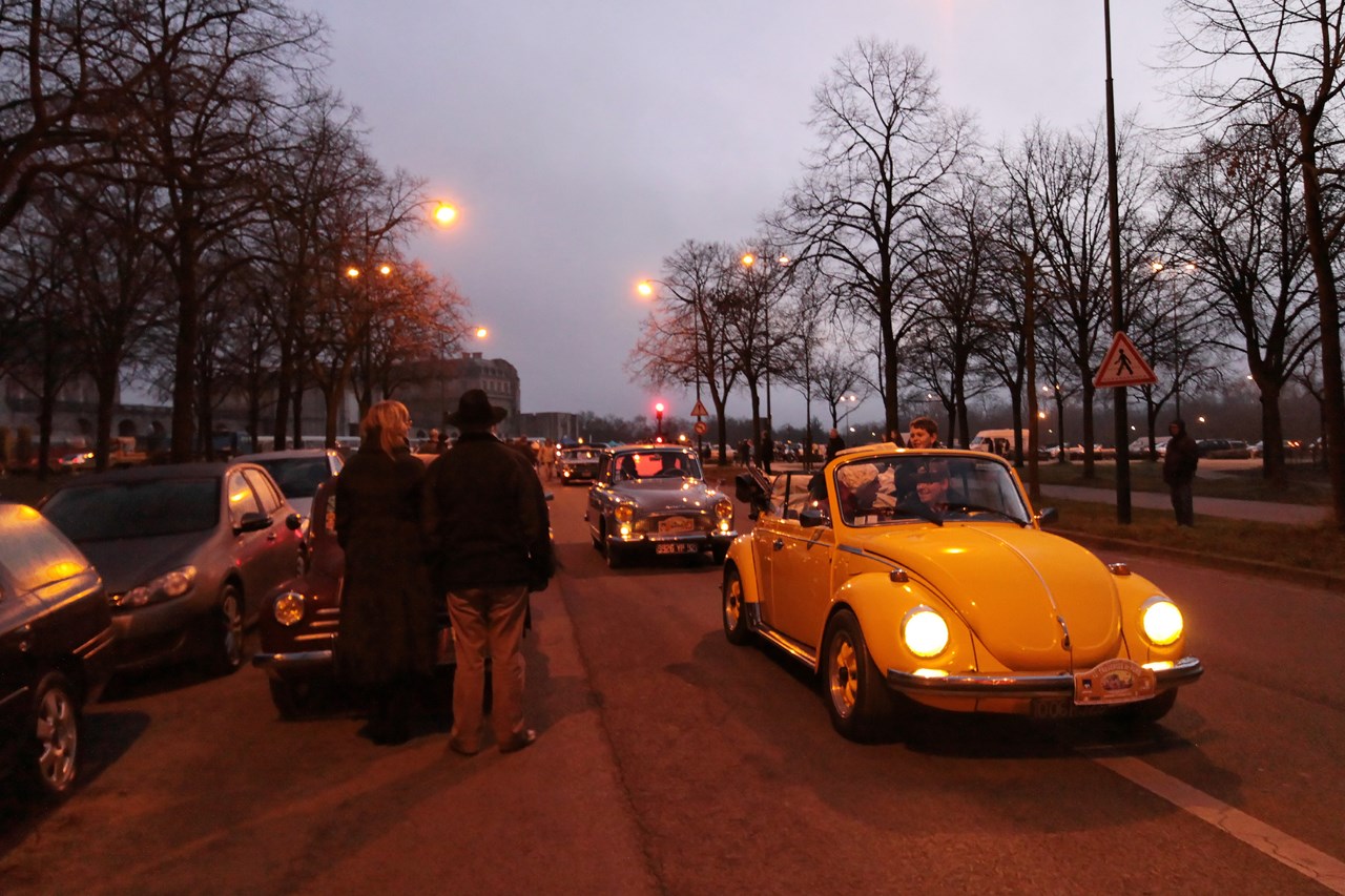 C’est sous l’escorte d’une VW Coccinelle et d’une Méhari que nous franchissons les boulevards des Maréchaux qui séparent Vincennes de Paris. Notre roadbook nous mène jusqu’à la place Félix Eboué, lieu des premières spots photographiques. Alors qu’une anglaise stationne sur le long du trottoir capot ouvert, nous poursuivons notre chemin sur l’avenue Daumesnil jusqu’à la Bastille. Durant ce tronçon nous dépassons une Jeep Willys battant pavillon américain, une Méhari bi-ton et deux Renault Estafette. L’arrêt à un feu rouge nous offre quelques palpitations quand une odeur d’huile et d’essence brûlées envahissent l’habitacle en cuir de notre voiture. Alors que « P.E » et moi même échangeons un regard inquiet, la présence de trois solex et d’une Sanford (voiture à 3 roues) nous rassure sur l’origine des ces émanations. Fin de l’alerte ! Avant de repartir, j’observe l’accoutrement du pilote de la Sanford et prend conscience du confort qu’offre le chauffage de notre voiture que j’ai qualifié de « faiblard » quelques kilomètres auparavant. Enfant gâté que je suis…