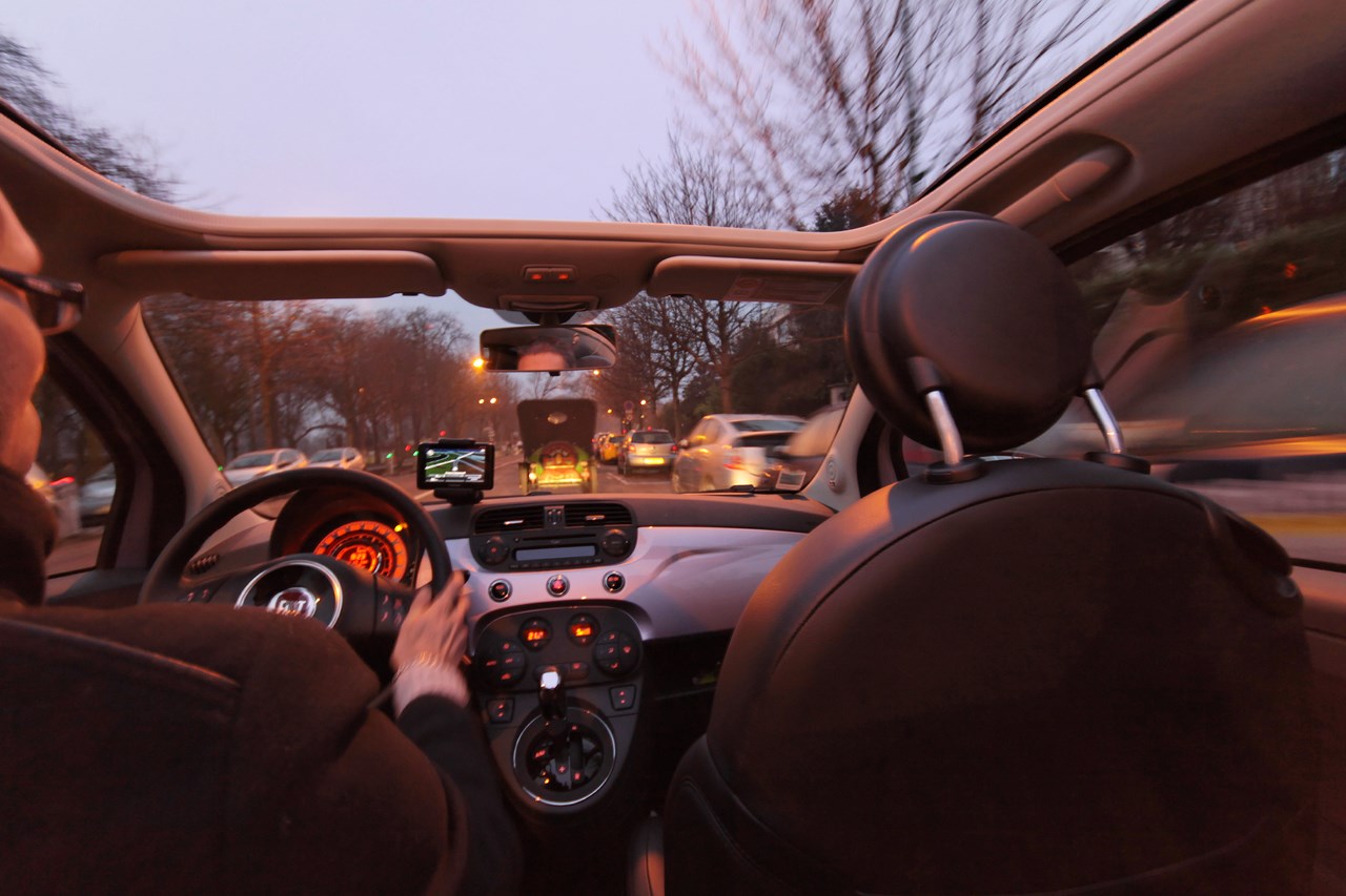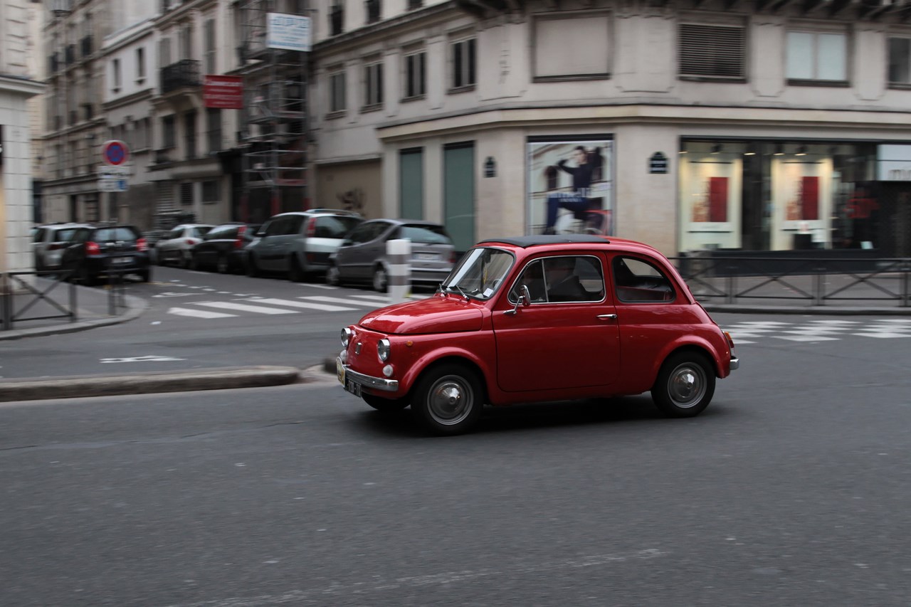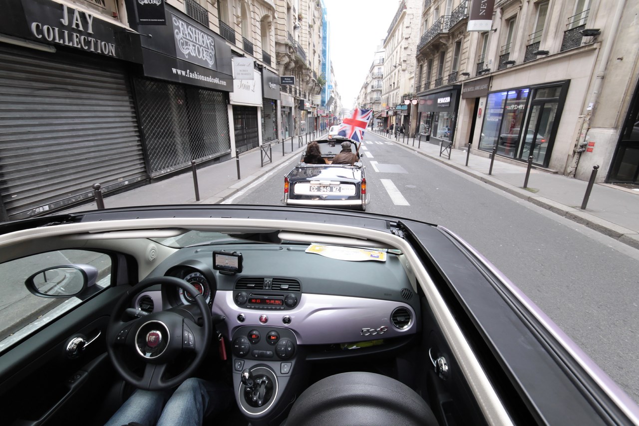 Après un briefing de « P.E » sur l’itinéraire à suivre, nous démarrons notre pot de yaourt moderne. Le son émis par son bicylindre interpelle les badauds et les commentaires ne tardent pas à venir. C’est le bruit de l’ancienne 500 ? Le moteur est à l’arrière ? Si la ressemblance est indéniable sur la plan sonore et le nombre de piston, la comparaison s’arrête là. En effet, le moteur TwinAir de 875 cm3 se trouve à l’avant, il est suralimenté par un turbo et développe 85 cv pour un couple de 145 Nm à 1900 tr/mn. A la fois économique et écologique avec son stop & start et ses 95 grammes de CO2 émis par km, c’est sans scrupule que nous nous élançons vers la capitale au rythme donné par le cortège d’anciennes. La cadence révèle la souplesse du moteur et la douceur de la boite de vitesse Dualogic qui équipe notre 500 C, permettant de faire des photographies sans secousse.