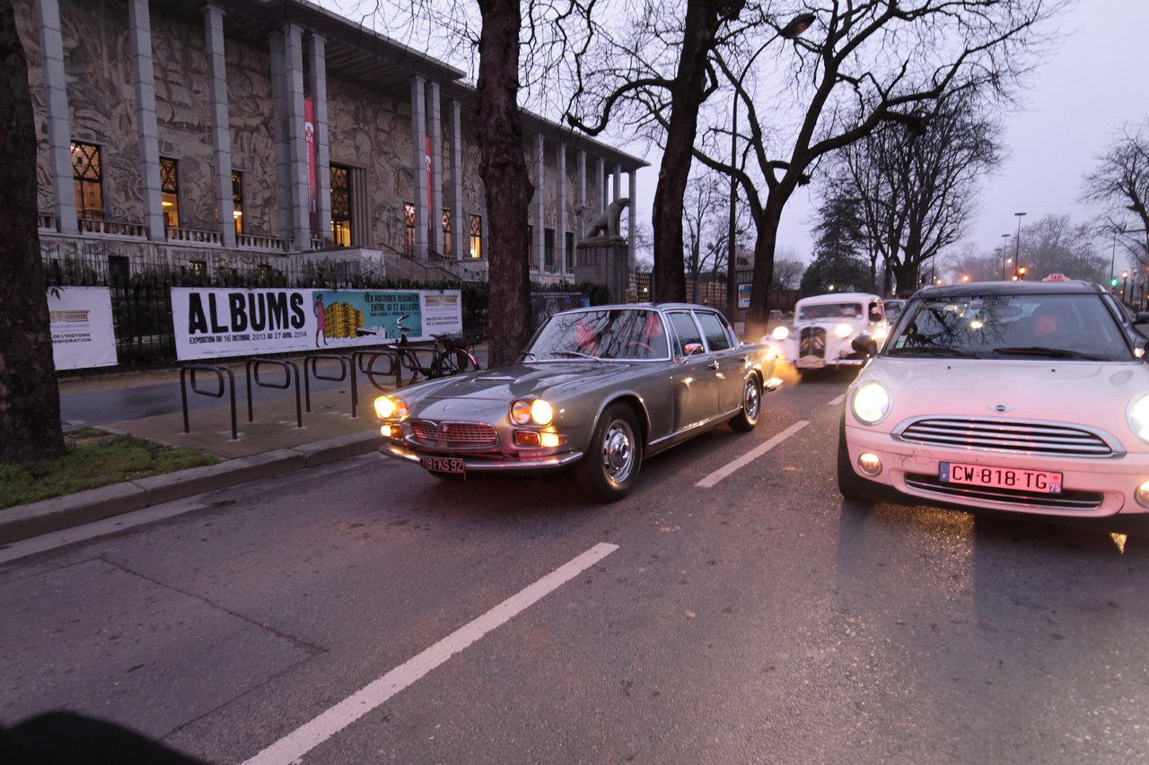 C’est sous l’escorte d’une VW Coccinelle et d’une Méhari que nous franchissons les boulevards des Maréchaux qui séparent Vincennes de Paris. Notre roadbook nous mène jusqu’à la place Félix Eboué, lieu des premières spots photographiques. Alors qu’une anglaise stationne sur le long du trottoir capot ouvert, nous poursuivons notre chemin sur l’avenue Daumesnil jusqu’à la Bastille. Durant ce tronçon nous dépassons une Jeep Willys battant pavillon américain, une Méhari bi-ton et deux Renault Estafette. L’arrêt à un feu rouge nous offre quelques palpitations quand une odeur d’huile et d’essence brûlées envahissent l’habitacle en cuir de notre voiture. Alors que “P.E” et moi même échangeons un regard inquiet, la présence de trois solex et d’une Sanford (voiture à 3 roues) nous rassure sur l’origine des ces émanations. Fin de l’alerte ! Avant de repartir, j’observe l’accoutrement du pilote de la Sanford et prend conscience du confort qu’offre le chauffage de notre voiture que j’ai qualifié de “faiblard” quelques kilomètres auparavant. Enfant gâté que je suis…