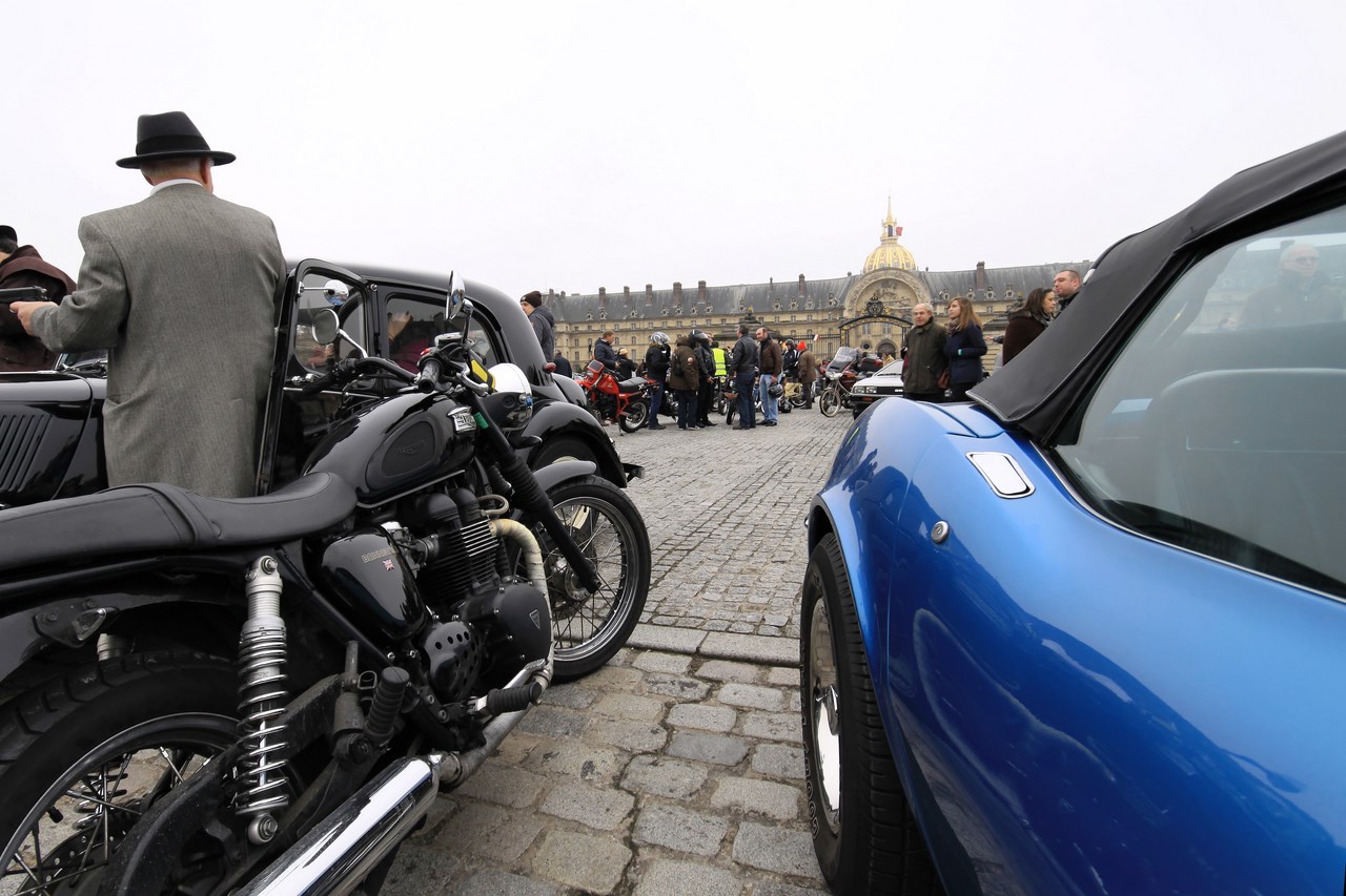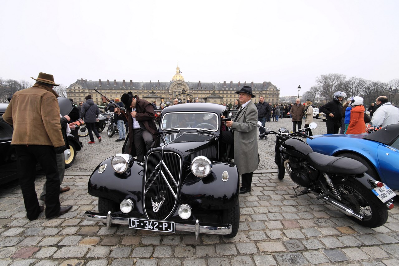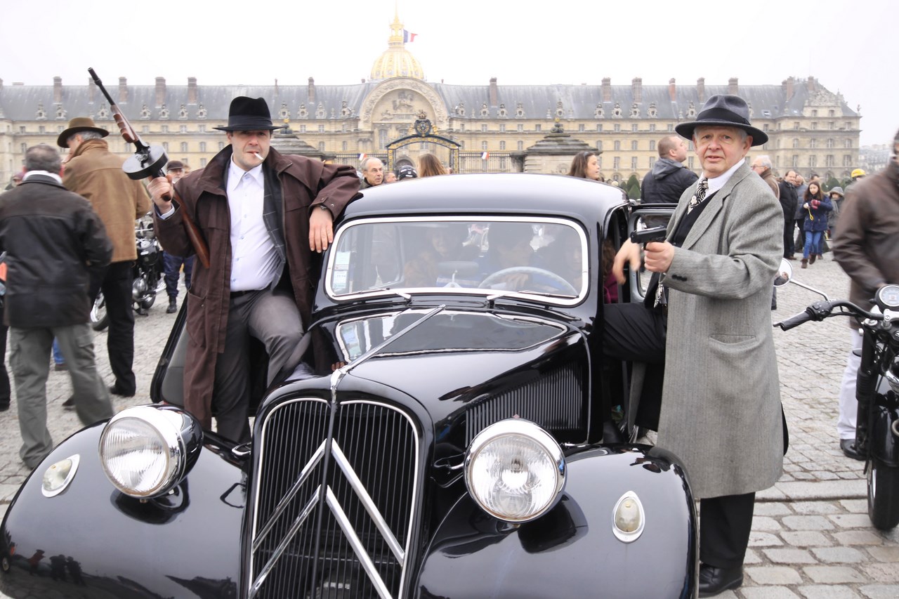 Après ce ravitaillement bénéfique pour l’équipage, nous décidons de ne plus suivre le parcours et de voler de nos propres ailes. Nous ne regretterons pas cette décision puisque Paris est maintenant assiégé par les voitures anciennes. La Place de la Concorde se transforme en musée automobile et les ponts parisiens qui mènent au Invalides sont magnifiés par la présence des Rolls-Royce, Delage et Delahay aux courbes sublimes. Nous décidons de mettre fin à notre traversée au pied du dôme des Invalides où deux mafieux armées jusqu’aux dents prennent la pose devant une Citroën Traction. Alors que nous quittons l’esplanade, le cortège de voiture repart en direction du Château de Vincennes, point d’arrivée de la traversée de Paris.