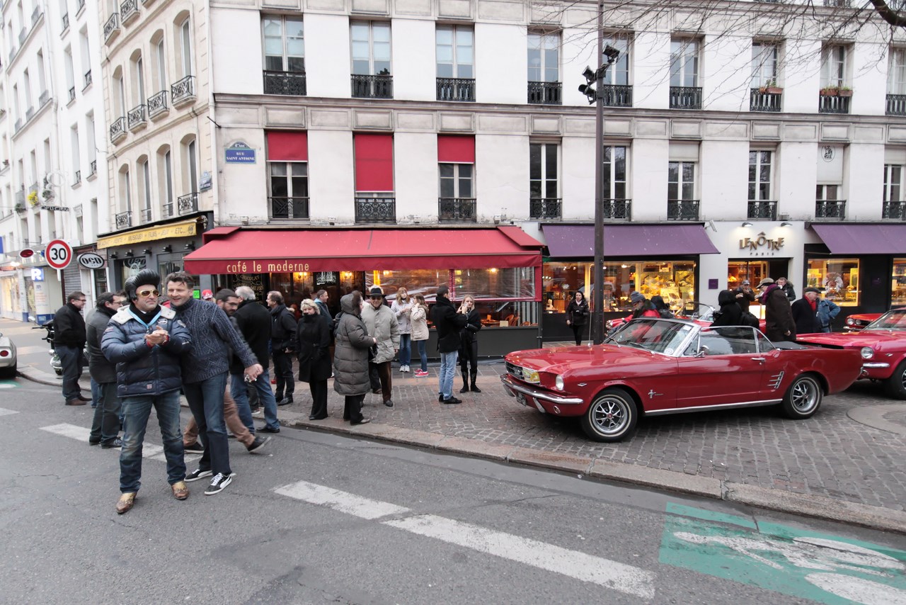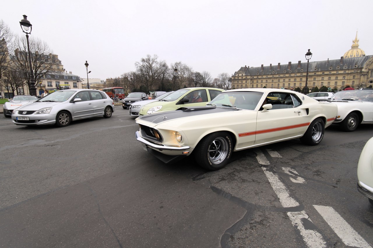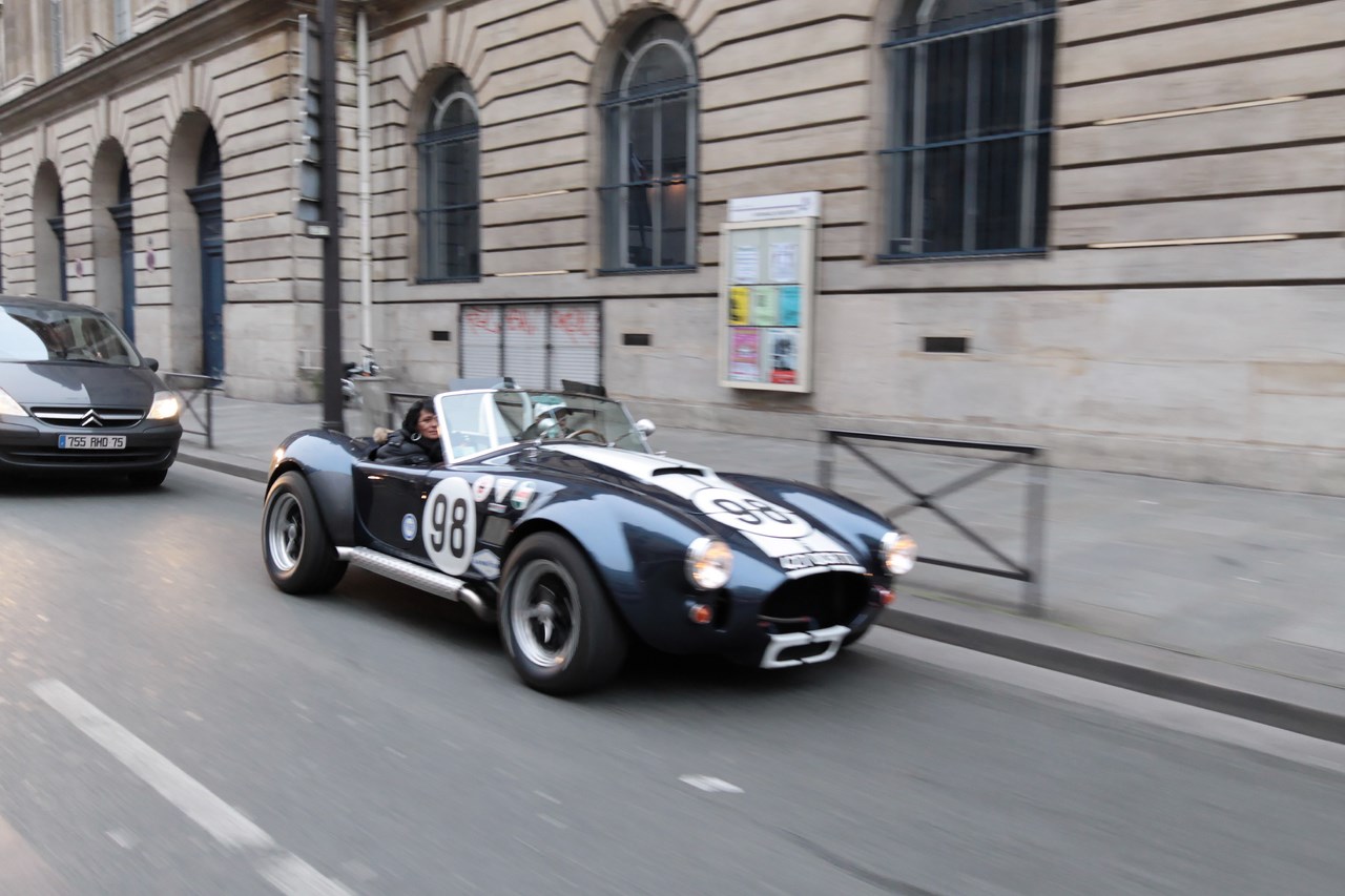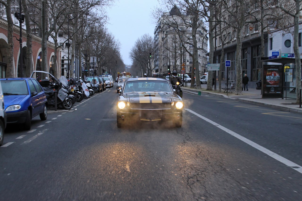 Une fois la place de la Bastille atteinte et quelques photos prisent, nous pénétrons dans la rue Saint Antoine où nous nous retrouvons nez à nez avec Elvis Presley et une Ford Mustang ! Très surpris par cette rencontre, je promets de ne plus inhaler les vapeurs de moteur deux temps… Trêve de plaisanterie, si l’image d’Elvis avec des cheveux en plastique type « Playmobil » est insolite, elle nous fait louper la prochaine étape de notre périple, la place des Vosges. Notre consolation se soldera par la remontée de la rue de Rivoli en compagnie de véhicules chargés d’histoire à l’image d’une AC cobra, Citroën DS, Peugeot 203 et Jaguar Type E. Après un passage devant la mairie de Paris, le boulevard Sébastopol est l’occasion pour les « Muscle cars » de faire parler les V8. Si « P.E » et moi même sommes réjouis, les passants sont terrorisés par le bruit de ces mécaniques musclées.