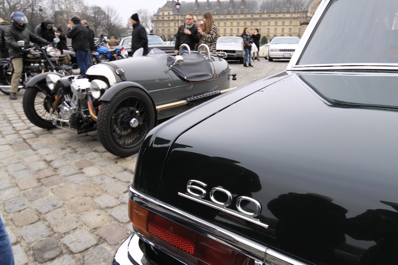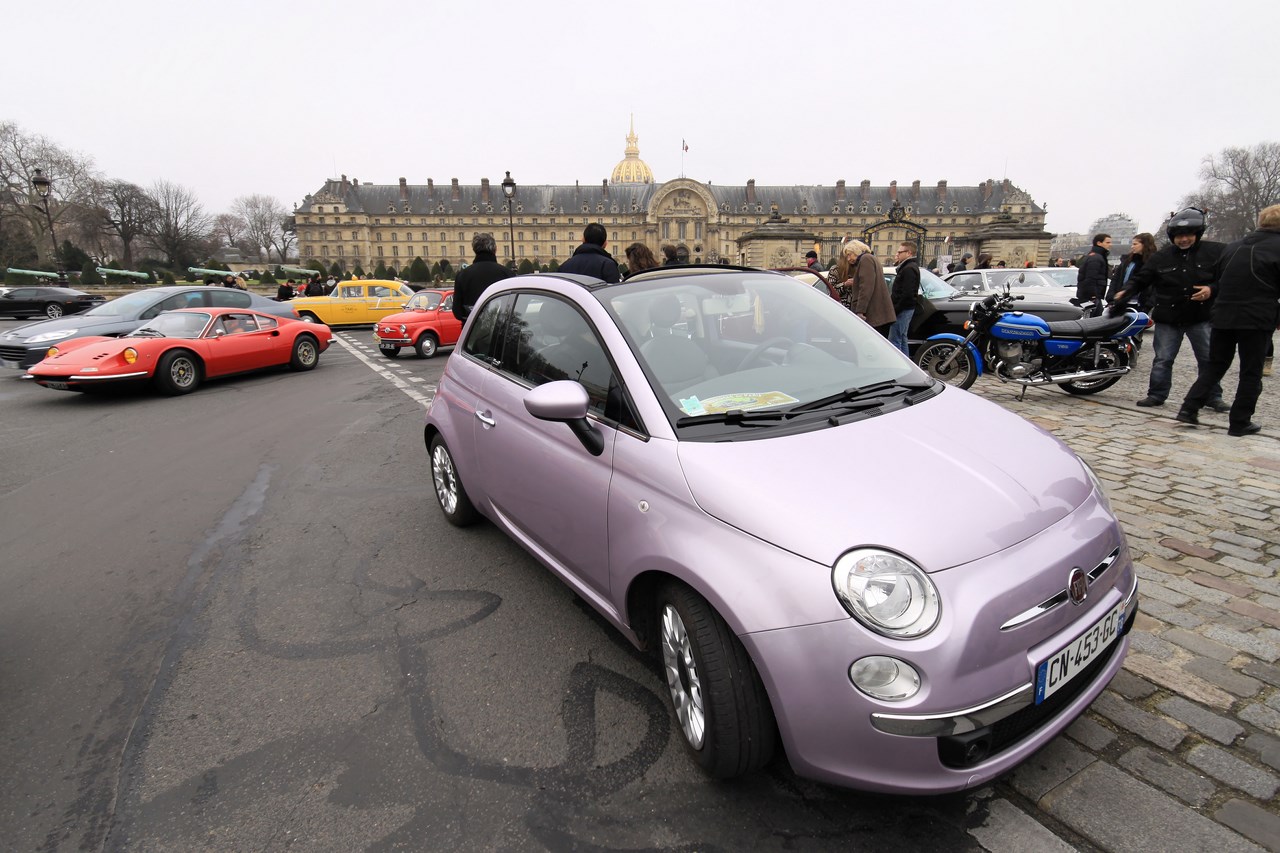 C’est au Château de Vincennes et dans un froid glacial que nous retrouvons les 600 voitures et 40 motos inscrites. Venus pour s’approprier les rues de la capitale le temps d’une matinée, ils transforment l’esplanade du Château en parking géant. Si mon copilote (P.E) et moi même assumons notre choix d’y participer en voiture moderne, cette démarche reste un sacrilège pour les propriétaires d’anciennes. Alors que nous tentons une arrivée discrète, le clin d’œil au passé et la teinte “Idol Pink” de notre 500C attire la sympathie des participants. Je tiens à ce sujet à remercier les designers d’avoir inventé le style néo-rétro qui nous évite de passer la journée au fond d’un cachot obscure du Château.