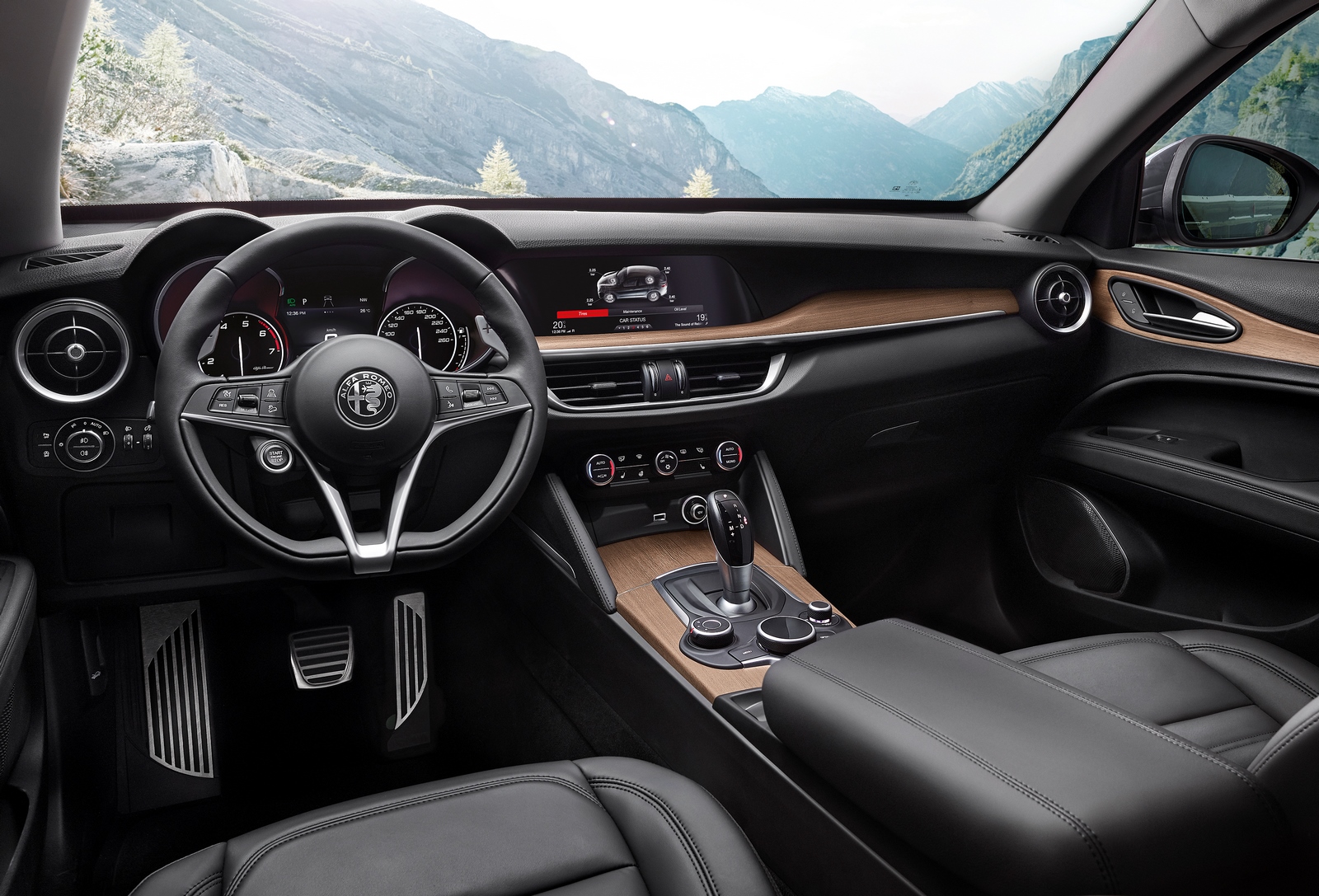 L’habitacle est traité avec beaucoup d’élégance et l’on retrouve les traits caractéristiques aux Alfa Roméo. Ainsi, la planche de bord au double bosselage est bien présente et elle s’habille d’un placage en bois véritable que l’on retrouve aussi sur la console centrale. Les sièges sont drapés d’un cuir “pleine fleur” de couleur noire, qui s’harmonise bien avec l’ensemble. La touche sportive est donnée par le volant multifonctions à trois branches, orné du bouton de démarrage. Pour plus de noblesse, les palettes situées derrière le volant et le pédalier sont en aluminium. Comme tout véhicule haut de gamme, le Stelvio est richement équipé avec de série : Les sièges électriques et chauffants à l’avant, l’allumage automatique des feux de route, le hayon à ouverture automatique, les capteurs de stationnement avant et arrière et une caméra de recul. Le conducteur dispose d’un écran couleurs TFT de 7” au centre de l’instrumentation et d’un écran de 8,8” placé au centre de la planche de bord qui renseigne sur les données de navigation en 3D (de dernière génération) et la radio numérique (DAB). Il est géré par le système d’infotainement.