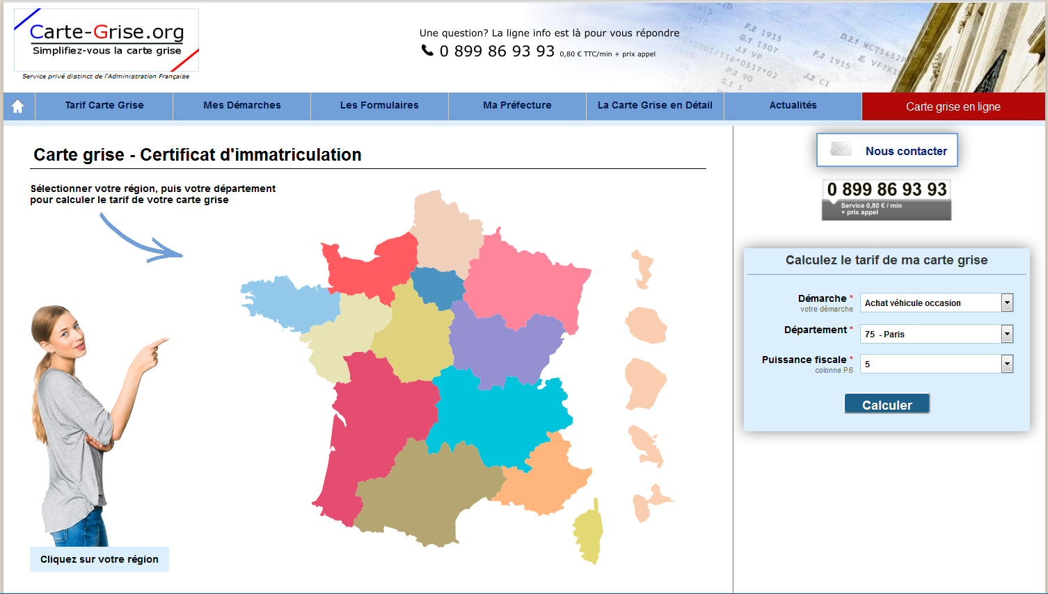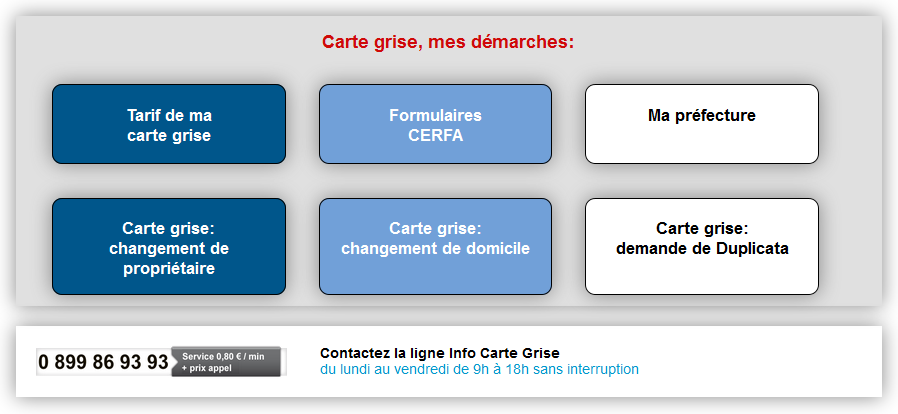 Afin de mieux s’y retrouver, Carte-grises.org mets à votre disposition un simulateur qui permet en quelques clics de connaitre le prix de votre carte grise. Gratuit et sans inscription, il suffit de rentrer son département, la puissance fiscale du véhicule et le type de démarche à effectuer. Pour plus de service, Carte-grise.org permet aussi d’effectuer en ligne toutes les démarches pour obtenir un certificat d’immatriculation, sans avoir à subir les contraintes d’un déplacement en préfecture. En cas de doute sur les démarches, un service client est disponible par téléphone du lundi au vendredi de 9h à 18h sans interruption.
