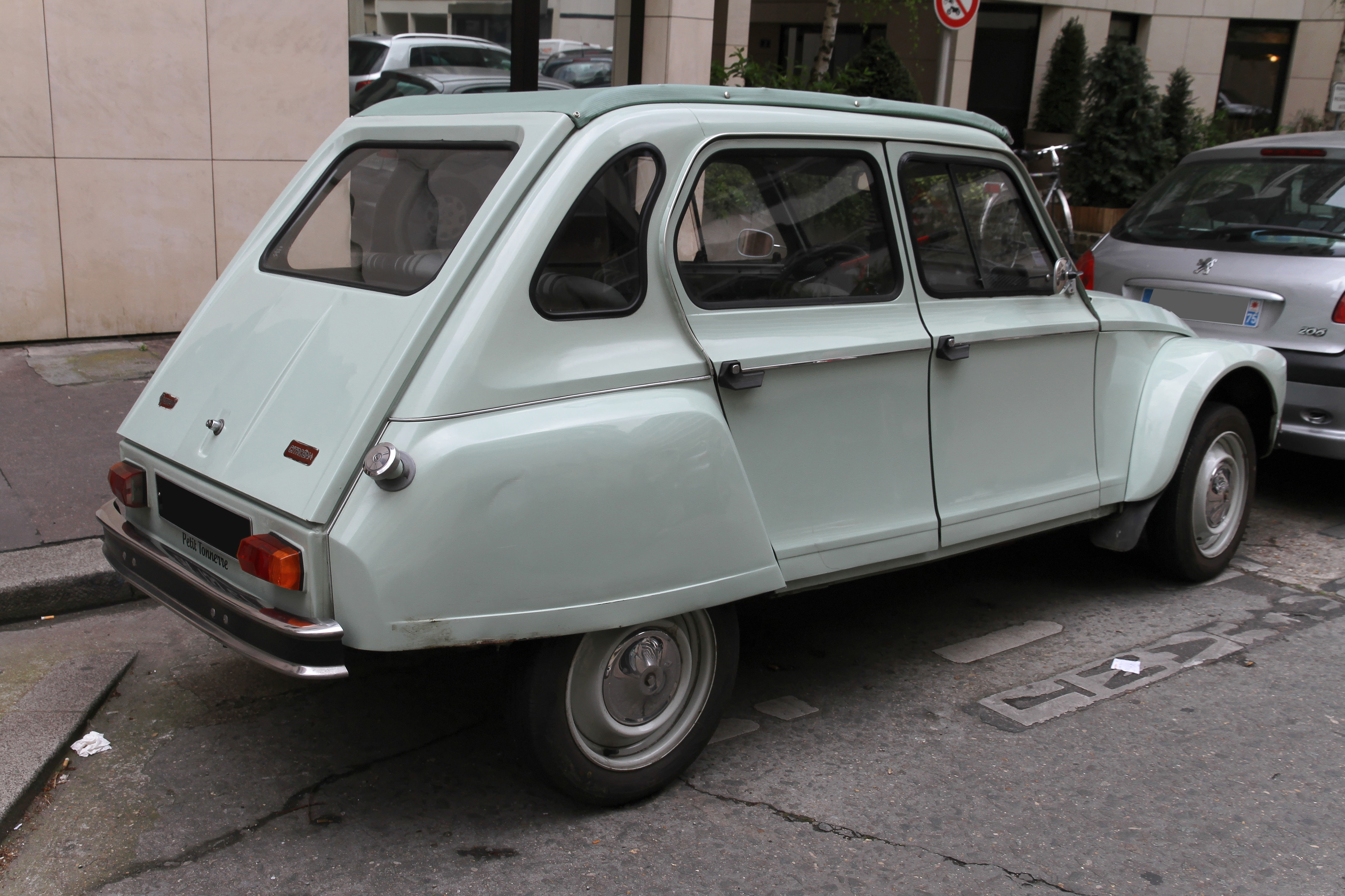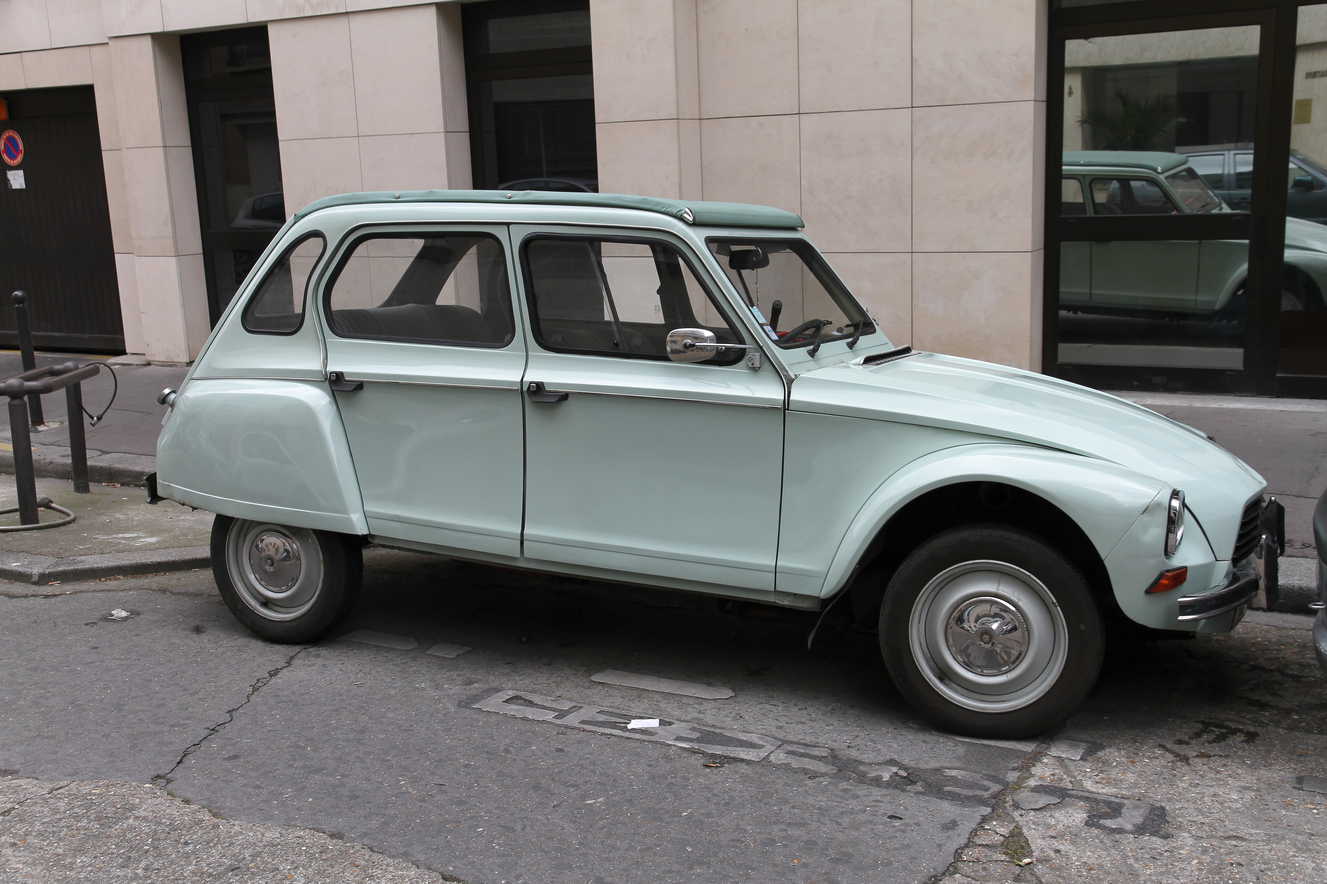 Aperçue à Paris, voici une superbe Citroën Dyane 6. D’après sa couleur, vert jade (AC 539), ce modèle aurai été produit entre 1980 et 1983. Sauf erreur, elle serait équipée du moteur de 602 cm³.