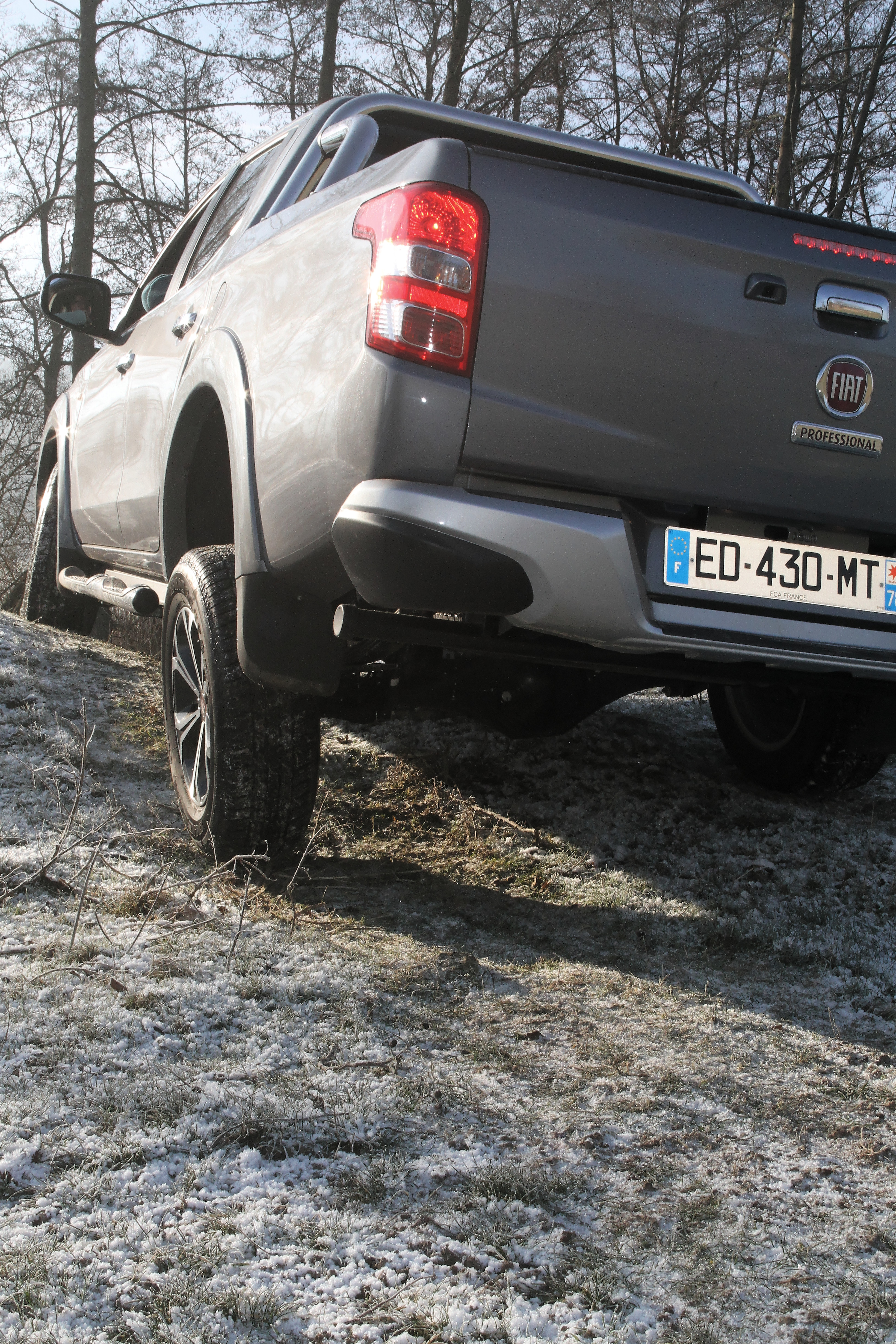 Il est clair que le Fullback ne peut renier ses origines avec le Mitsubishi L200. Copie conforme jusqu’au châssis en échelle, il est plus séduisant par l’adoption d’une nouvelle calandre noire à lames horizontales (chrome et verticales sur le L200) et d’un spoiler percé par une nouvelle prise d’air plus large. Plus large, mais aussi moins épaisse. Elle permet au sabot de protection bi-ton (uni sur le L200) de monter plus haut et de repousser les nouveaux antibrouillards aux extrémités. Si durant notre essai les passants étaient nombreux à se retourner sur notre passage, les regards étaient souvent suivis de commentaires : “Tiens, Fiat fabrique des Pick-up ?“C’est une Mitsubishi à la base ? “Il est beau !” Et c’est vrai qu’il est beau ce Fullback. Aussi imposant soit-il, sa ligne légèrement plongeante marquée d’une large virgule, qui sépare l’habitacle de la benne de chargement, lui donne une identité propre. De plus les élargisseurs d’ailes abritent de belles jantes aluminium de 17″. Pour le reste, on notera la présence d’un arceau, de marches pieds chromés et du monogramme “Fullback” apposé sur la malle arrière.