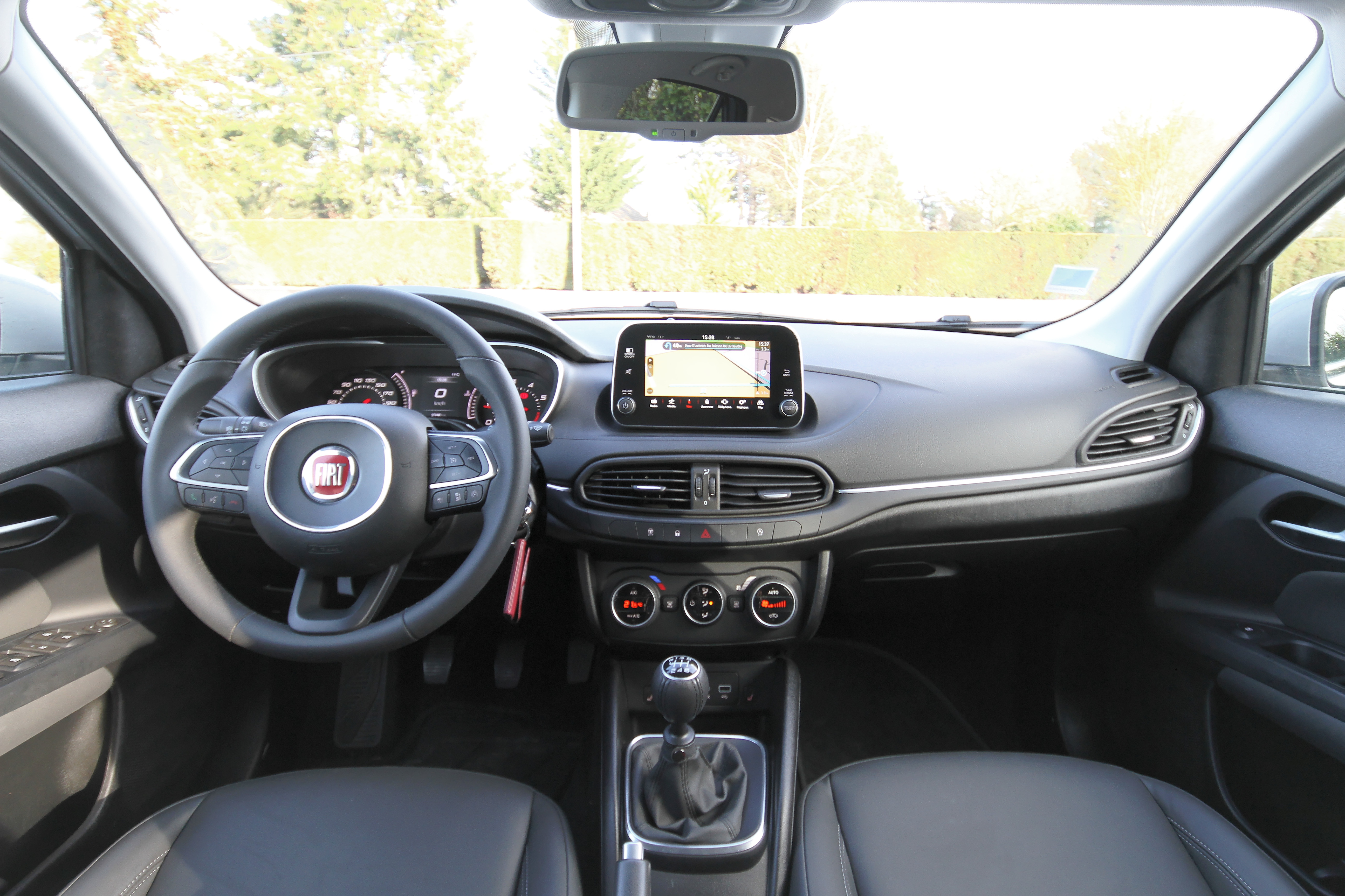 Une fois à bord, le conducteur fait face à une planche de bord dont la finition est flatteuse, même si on regrette la présence de certains plastiques durs mal ajustés. L’agencement et l’ergonomie sont plaisants avec une présentation classique : Volant multifonction à trois branches, combiné d’instrument à aiguille rouge grée d’un écran TFT monochrome, tablette tactile de grande taille (18 cm) pour la navigation et commandes de chauffage à molettes à indications rouge. On apprécie aussi, les nombreux rangements (12 litres au total) qui permettent de stocker des bouteilles, de la monnaie et des téléphones. La console centrale est agrémentée de trois prises pour les connectiques : Prise 12 v, jack et USB. Comme nous l’évoquions un peu plus haut, notre Tipo SW dispose du niveau de finition « Lounge » (le plus haut), qui propose de série une liste d’équipement plutôt complète :