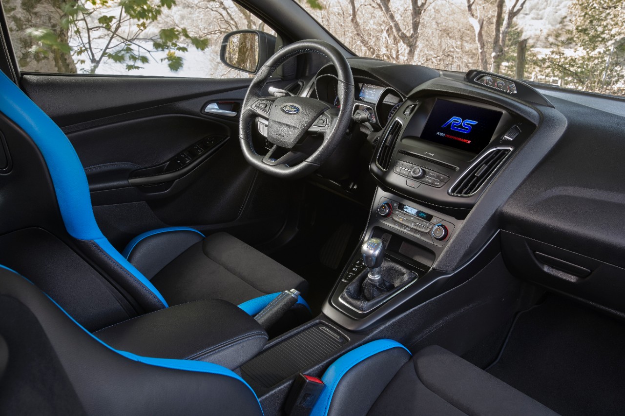 La nouveau Pack Performance offre quelques modifications estétiques à la Ford Focus RS. Ainsi, la carrosserie adopte la teinte spéciale “Bleu Nitrous”, avec le toit en finition noir mat, qui s’applique aussi sur les rétroviseurs et le béquet arrière. Sur ce dernier, le logo bleu “RS” est intégré aux ailettes. Le nouveau “Pack Performance” comprend aussi des jantes alliage noires de 19 pouces frappées du logo “RS”. Elles abritent des étriers monoblocs “Brembo” en aluminium à quatre pistons de couleur carrosserie. Dans l’habitacle, les sièges baquets “Recaro” sont drapés d’un cuir bi-tons (bleu Nitrous et noir) frappés du logo “RS”.