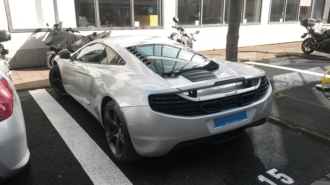 Ce n’est pas tous les jours que l’on croise une MacLaren dans la rue. Pour ma part, J’ai eu la chance d’en croiser une à Issy les Moulineaux. C’est une 12 C Coupé, qui a été fabriquée entre 2011 et 2014. Ce modèle a succédé à la redoutable F1 qui avait été mise au point part Gordon Murray en 1993. Ici pas de V12, mais un V8 (M838T) de 3 799cm3 à 32 soupapes qui utilise la technologie Twin-turbo. La puissance ressort à 625 ch à 7 500 tr/mn pour un couple de 600 Nm disponible de 3 000 à 7000 tr/mn. La transmission se fait sur le train arrière avec une boite séquentielle (SSG) à 7 rapports.