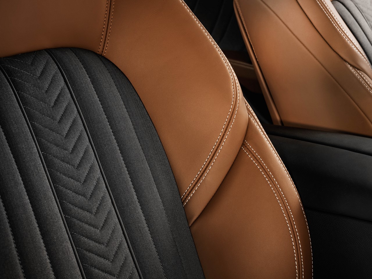 Inspirée de la mode masculine actuelle, cette bichromie qui rappelle un costume à chevrons, a été spécialement mise au point pour cette voiture. L’association du cuir et de la soie confère à cet intérieur force et douceur.