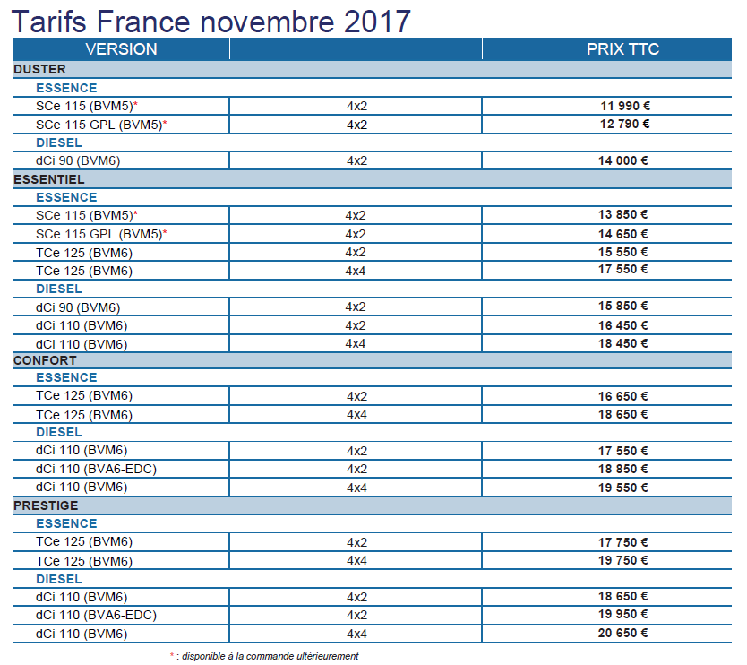 Les prix du nouveau Duster s’échelonnent de 11 990 € à 20 650 € avec une garantie de 3 ans ou 100 000 km.