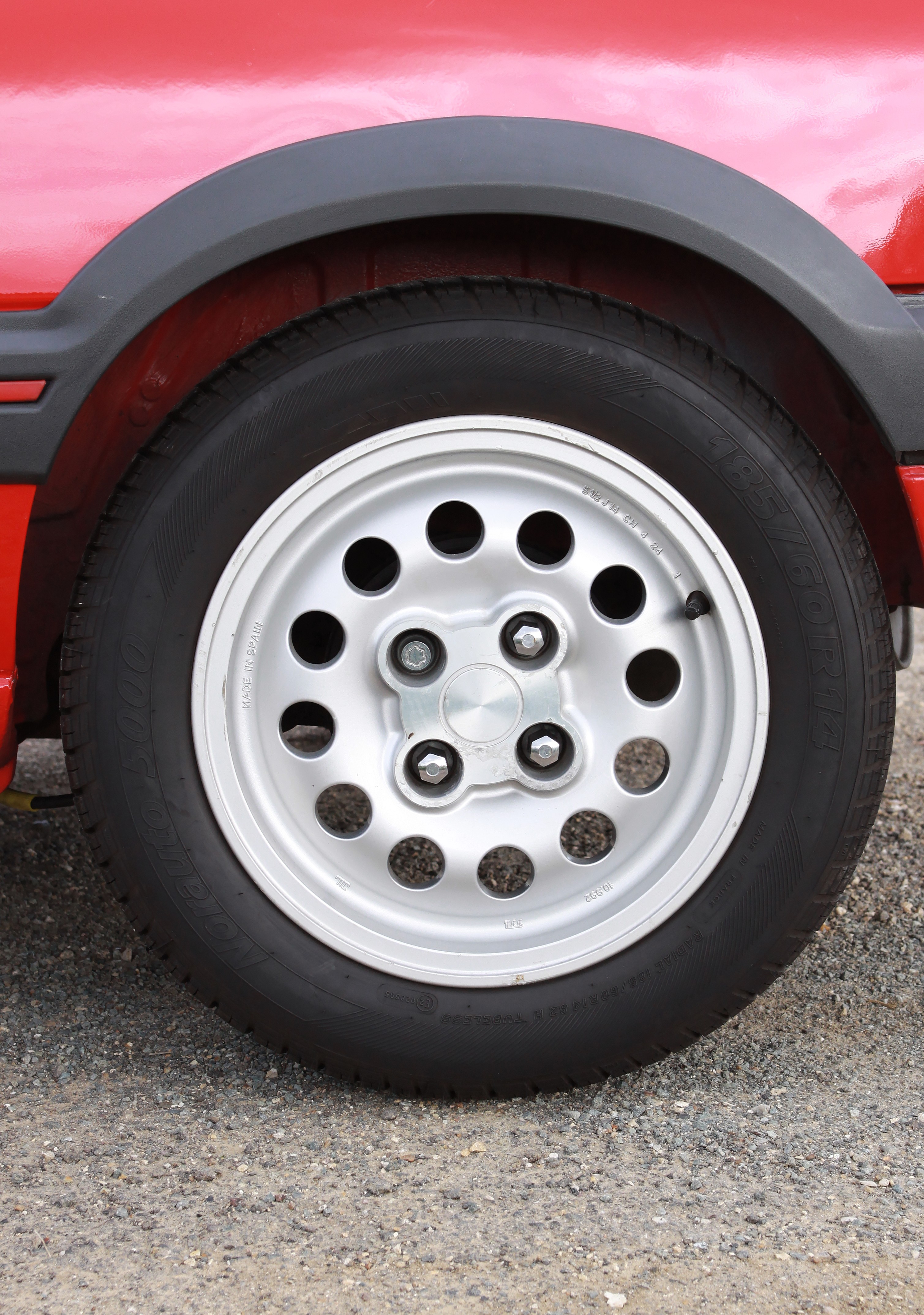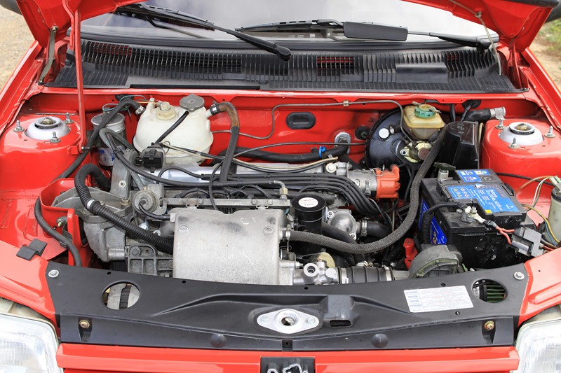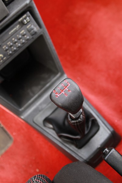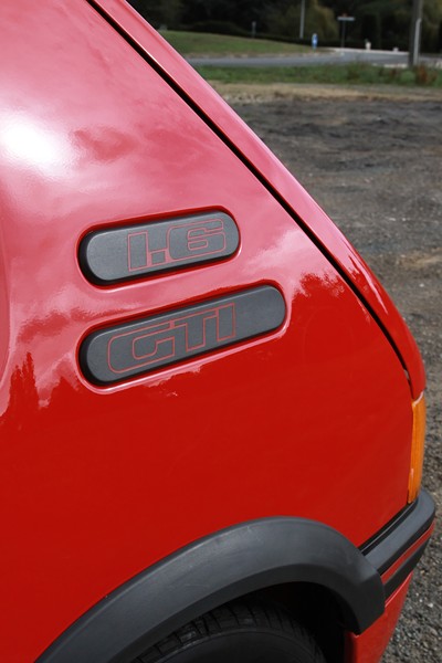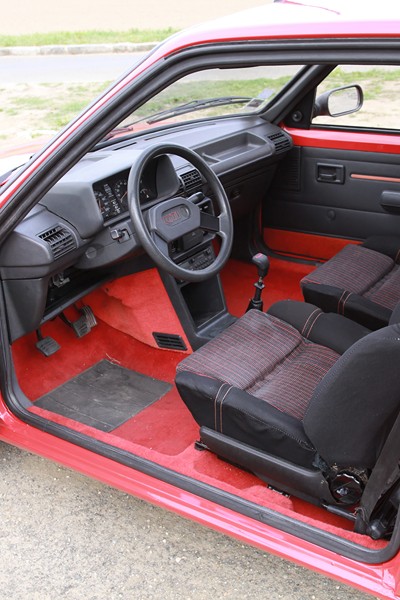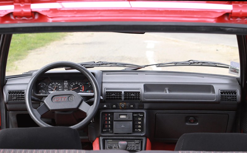 L’esprit sportif largement souligné à l’extérieur l’est aussi à l’intérieur. Le couleur rouge domine et recouvre la moquette, la grille du levier de vitesse, les aiguilles de compteurs et le sigle GTI du volant à deux branches. Le tissu des sièges semi-baquets est spécifique à cette version et arbore aussi la couleur rouge. La planche de bord présente bien, avec des assemblages soignés et des commandes qui tombent bien sous la main. L’absence de direction assistée et de vitres électriques trahissent son appartenance à une époque où les constructeurs automobile étaient concentrés sur la performance. Ici les équipements superflus (Airbag, ABS, climatisation et GPS) étaient bannis. Seule une banquette arrière rabattable en deux parties était présente pour offrir un peu de modularité.