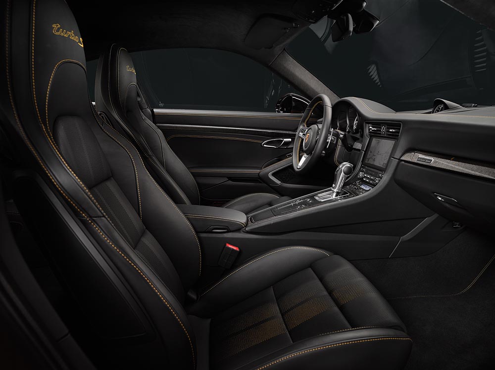 L’habitacle offre une finition spécifique avec des matériaux de grande qualité. Ainsi, les sièges sport sont drapés d’une double couche de cuir, dont la couche supérieure est perforée et marquée de deux bandes « Jaune Or », qui parcours aussi le ciel de toit en alcantara. Pour un contraste optimal, les surpiqûres et la signature Turbo S brodés sur les appuie-têtes sont également de couleur « Jaune Or ». Si le carbone est omniprésent, il est ici agrémenté de fils métalliques dorés sur les baguettes décoratives du « Pack intérieur Carbone » qui habille aussi les seuils de porte gravés d’un monogramme « Exclusive Series » rétroéclairé. Comme toutes les séries limitées, les 500 voitures arborent une plaque qui comprend le numéro d’exemplaire.
