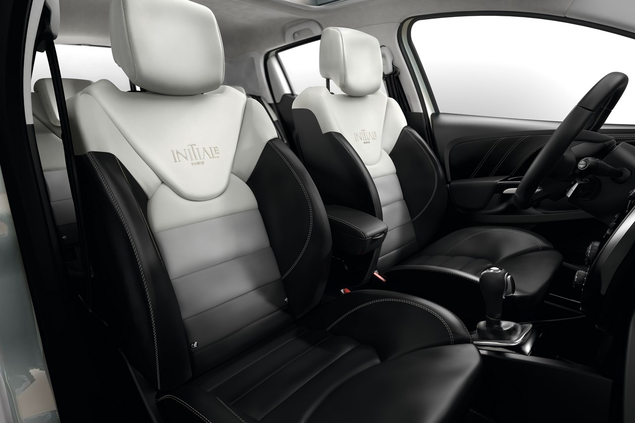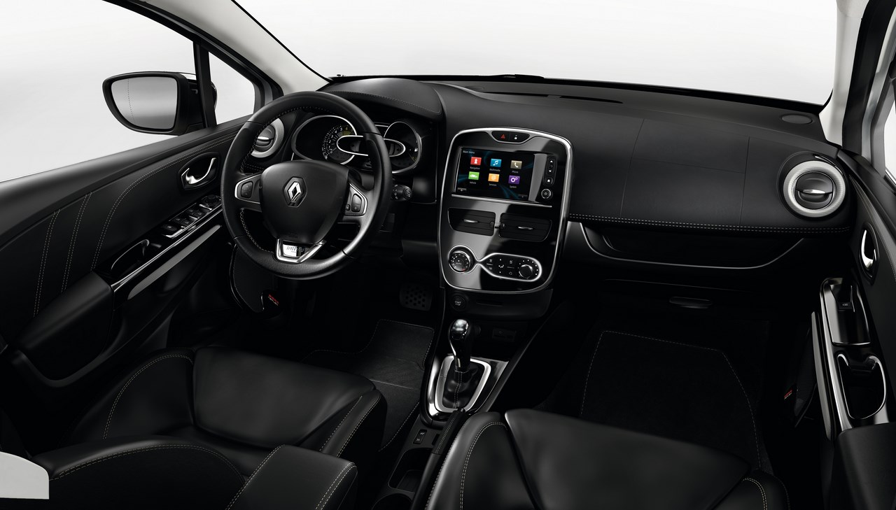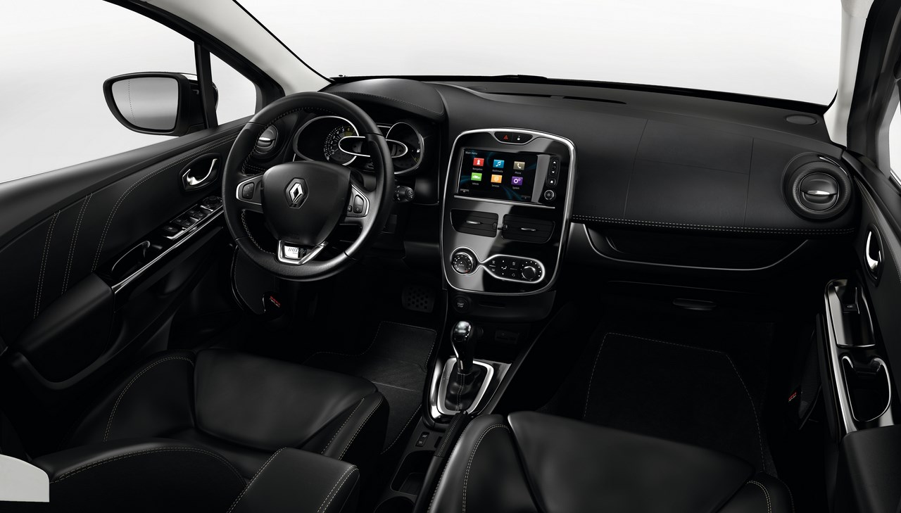 A l’intérieur Clio Initiale Paris reprend les équipements de série de la Clio « Intens ». Un soin particulier a été apporté aux sièges enveloppants (cuir Nappa) réglables en hauteur, chauffants et griffés d’une broderie Initiale Paris sur le dossier. Le cuir s’étend sur le volant alors que la planche de bord et les médaillons de porte sont gainés façon cuir avec des surpiqûres Vanille. Quelques détails valorisent encore l’habitacle : des surtapis, des décors intérieurs assortis à la teinte de la caisse, un pédalier en aluminium, un ciel de toit en suédine et un pack éclairage raffiné sur le totem de planche de bord, le plafonnier et la boîte à gants.