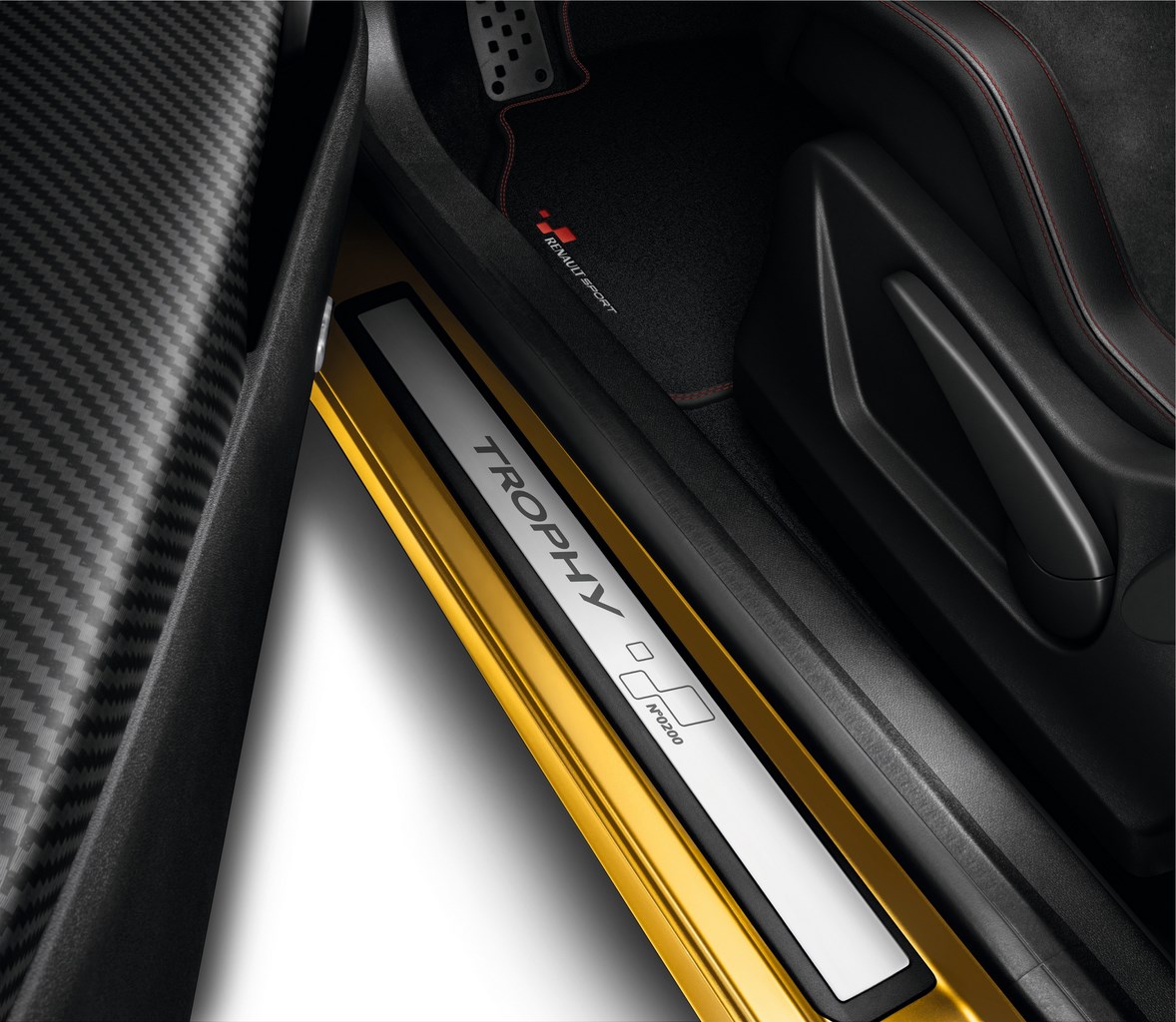 La série limitée affiche un style exclusif, à l’extérieur comme à l’intérieur. La nouvelle livrée affiche un sticker Trophy sur la lame F1 gris platine. Le stripping latéral « Trophy », personnalisant les côtés de caisse, et le damier filaire présent sur les bas de porte sont également gris platine. Les enjoliveurs de bas de marche numérotés signent l’exclusivité de la série limitée.