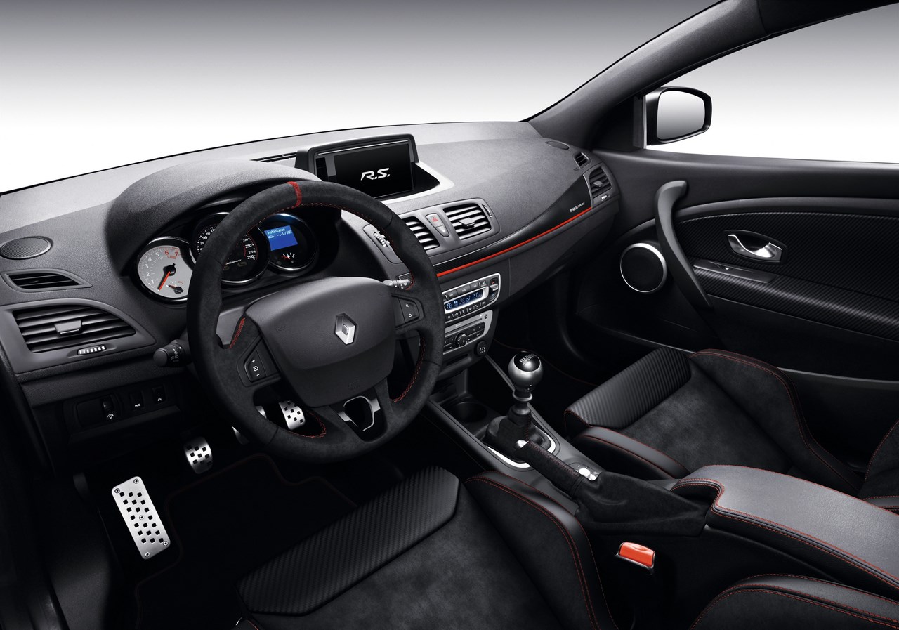 Mégane R.S. 275 Trophy propose des sièges baquets Recaro en cuir et alcantara rehaussés de surpiqures rouges, surpiqures que l’on retrouve sur la banquette arrière. Les appuis-tête sont siglés Renault Sport. De nombreux détails viennent habiller l’intérieur : volant et soufflet de frein à main en alcantara avec surpiqures rouges, pommeau de levier de vitesse Zamac…