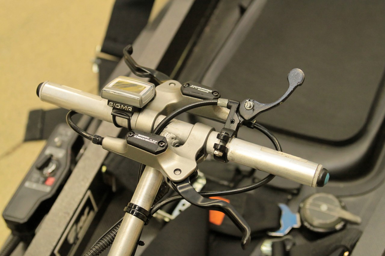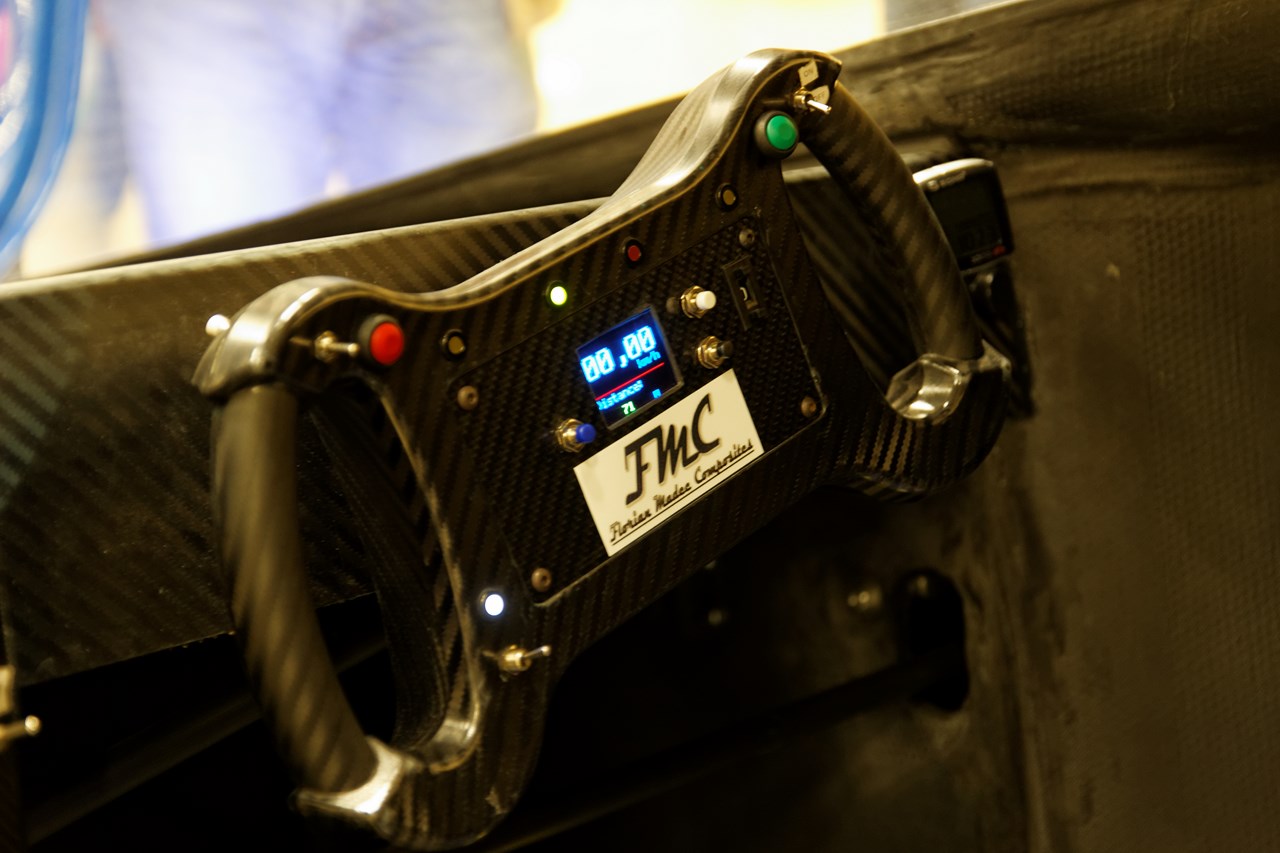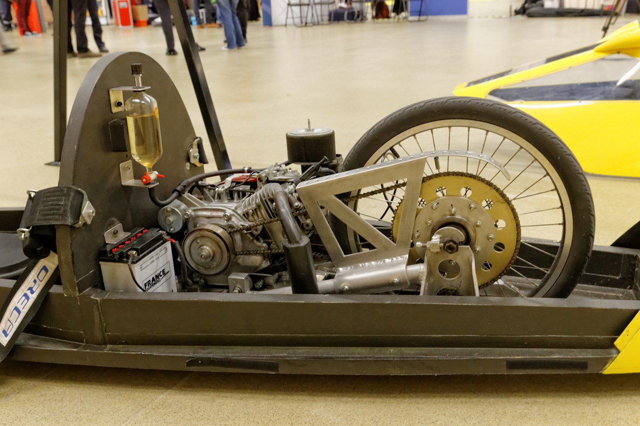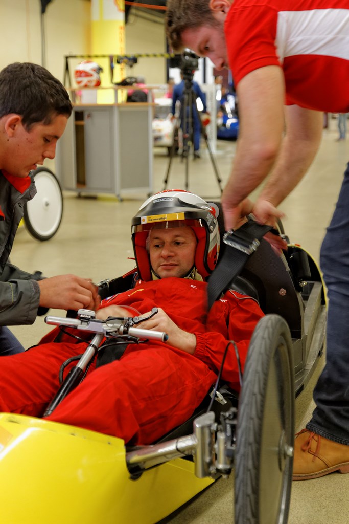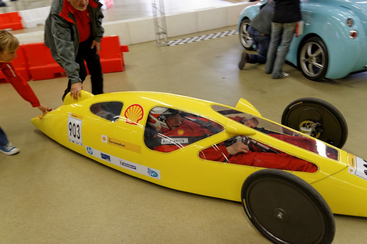 A l’occasion de cette rencontre, j’ai pu prendre le volant de deux voitures : prototype et Urban Concept qui ont participé par le passé à la compétition. Le prototype reste intriguant par la disposition de ses roues (2 avant et 1 arrière), sa forme longue, sa faible largeur et sa hauteur réduite qui donne quelques inquiétudes sur la position de conduite à adopter. Une fois le haut de la carrosserie enlevée, je prends place dans le châssis et glisse difficilement mes chaussures de taille 41 dans un espace prévu pour un 37. Malgré un large sourire, j’ai du mal à dissimuler la position inconfortable dans laquelle je suis. Avec l’aide de l’assistance, j’attache le harnais 3 points et une autre personne me briffe sur la disposition des commandes pour piloter le prototype. Réunis sur un simple guidon, manipuler du bout des doigts l’accélérateur, le frein avant et arrière indépendants, le klaxon et le bouton de coupure, est une chose difficile sans un minimum d’expérience. Avant de me pousser sur la ligne de départ, l’équipe d’assistance remet la carrosserie sur le prototype. Pris au piège dans cet étroit tunnel de fibre, la tête relevée, le casque collé au pare-brise et les pieds en canard tendus vers l’avant, me donnent l’impression de subir une séance d’ostéopathie faite par un débutant. En position de départ, l’assistance me demande de mettre le moteur en route via un petit bouton situé sur le châssis. J’actionne le démarreur et le monocylindre s’ébroue en propageant ses vibrations dans toute ma colonne vertébrale. Au top départ du commissaire de piste, j’actionne l’accélérateur et le prototype s’élance doucement en donnant des à-coups qui disparaissent au bout de quelques mètres. Alors que je m’efforce d’apercevoir la piste à travers le minuscule pare-brise, j’arrive au premier virage. La direction légère et précise me permet de placer le train avant au millimètre et j’enroule la courbe avec une certaine aisance. Vite pris au jeu par la précision du châssis, mon rythme effréné me fait oublier que la voiture est conçue pour battre des records de consommation plutôt que vitesse. De retour au stand, un membre de l’assistance m’assure que je ne battrai jamais un record du monde. Zut, examen loupé !