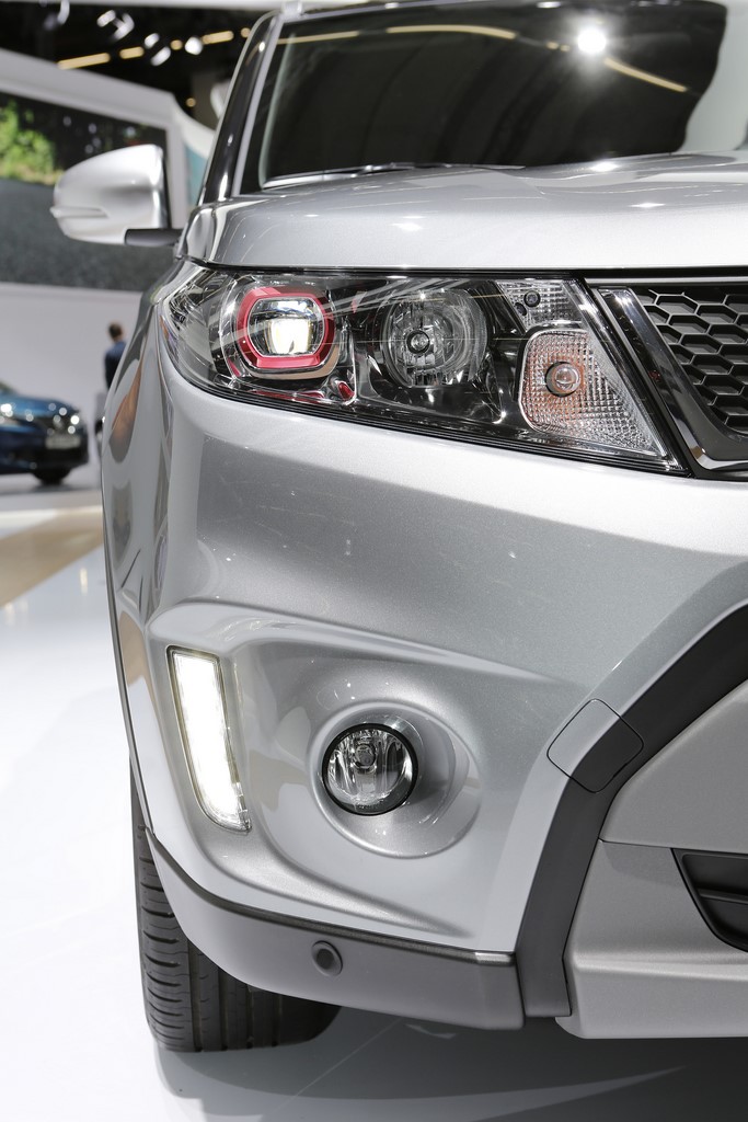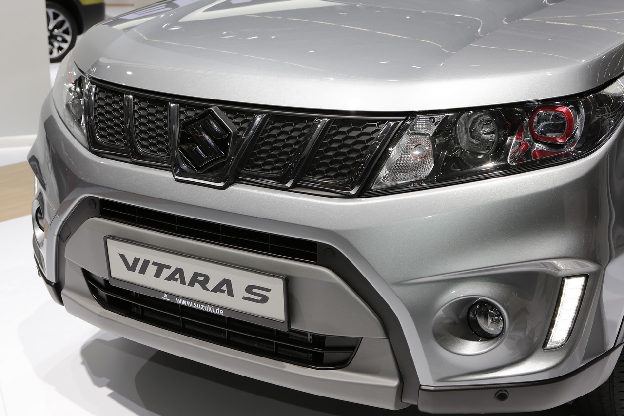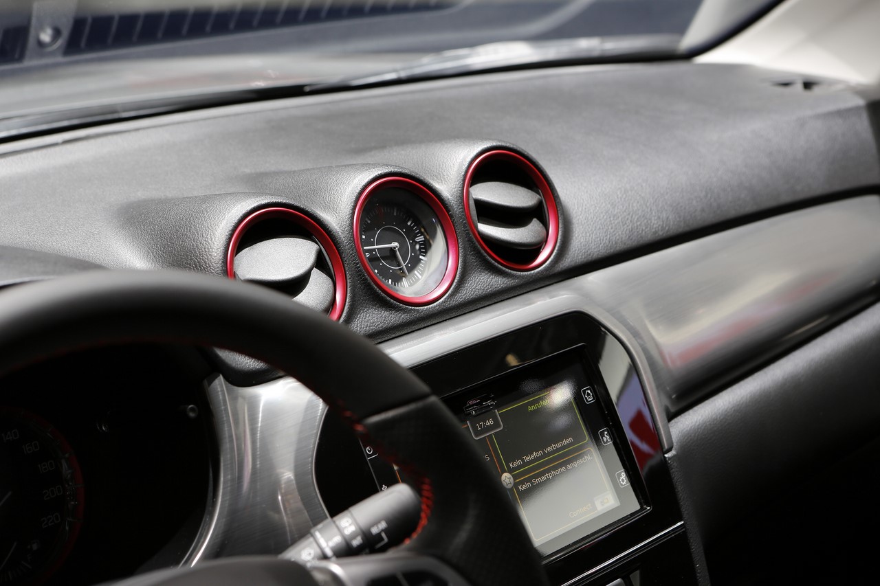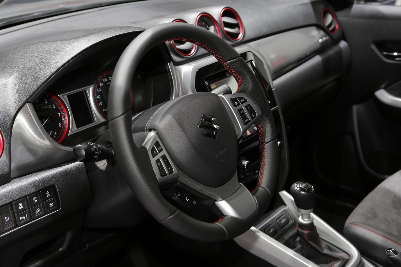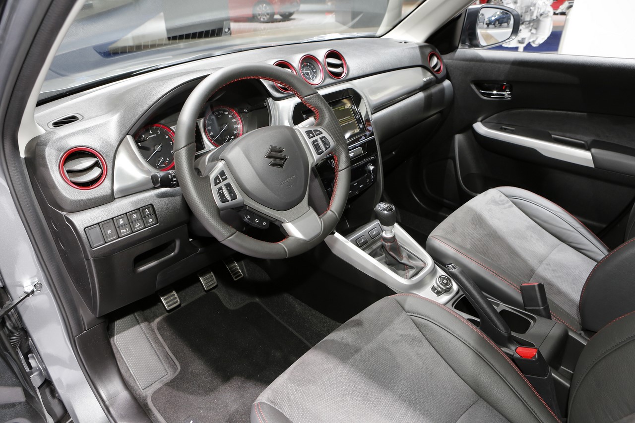 Présenté au Salon de Francfort 2015, le nouveau “Vitara S” s’identifie du premier coup d’œil par sa signature lumineuse à LED garnie de cerclages rouges. Ses optiques encadrent une nouvelle calandre et ses rétroviseurs s’affichent désormais en gris satin. Les grandes arches de roues abritent de nouvelles jantes alliage de 17’’ noires, qui donnent un look plus dynamique au SUV japonais. On l’apprécie dans cette finition grise à toit noir qui illustre cet article. A cette occasion, le constructeur dévoile une teinte “Brigth Red” qui complète la palette des 14 combinaisons de couleur déjà disponibles. Elle s’ajoute aux 8 combinaisons “So’Color” disponible en option, qui recouvrent les montants et le toit.