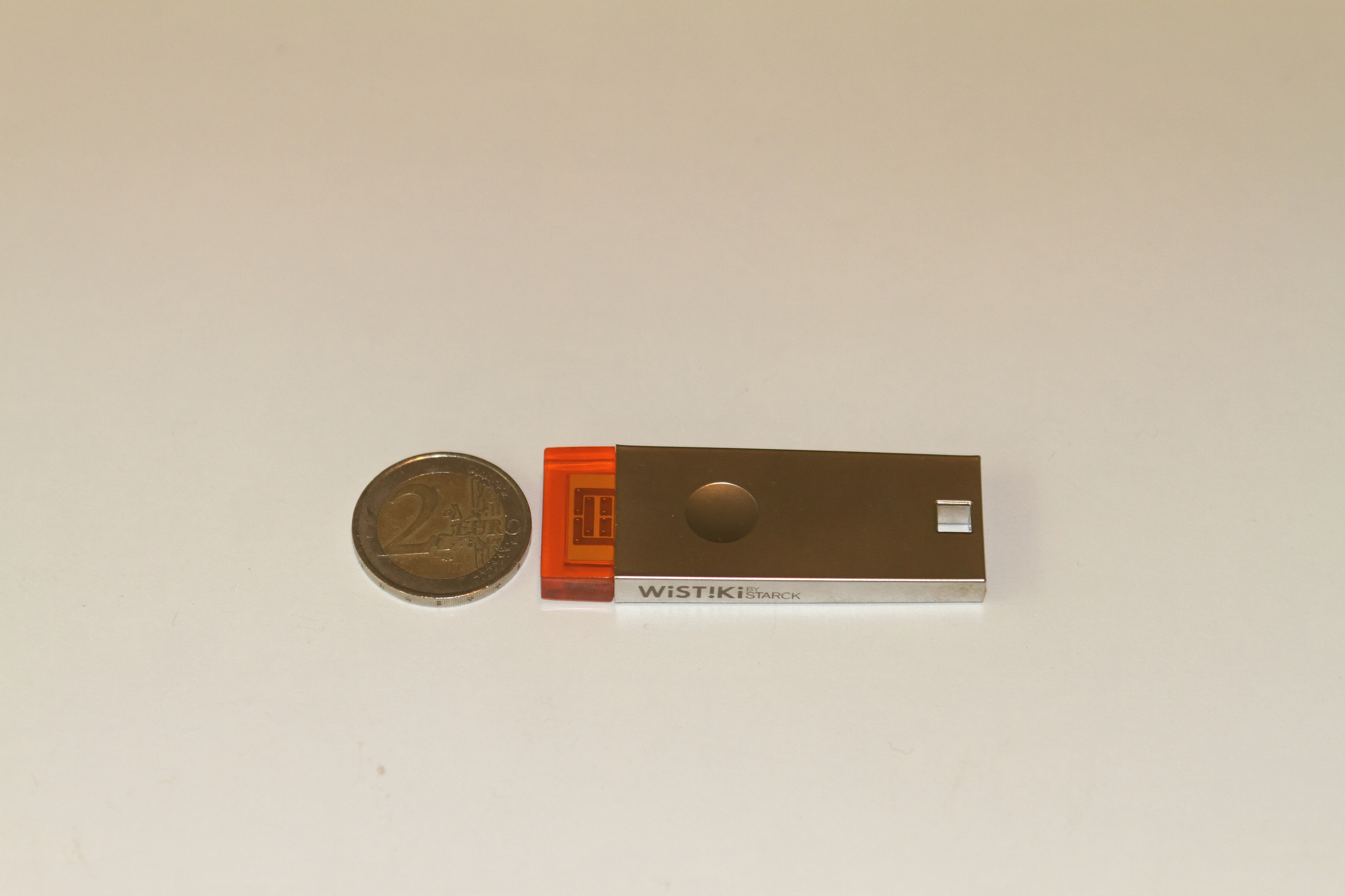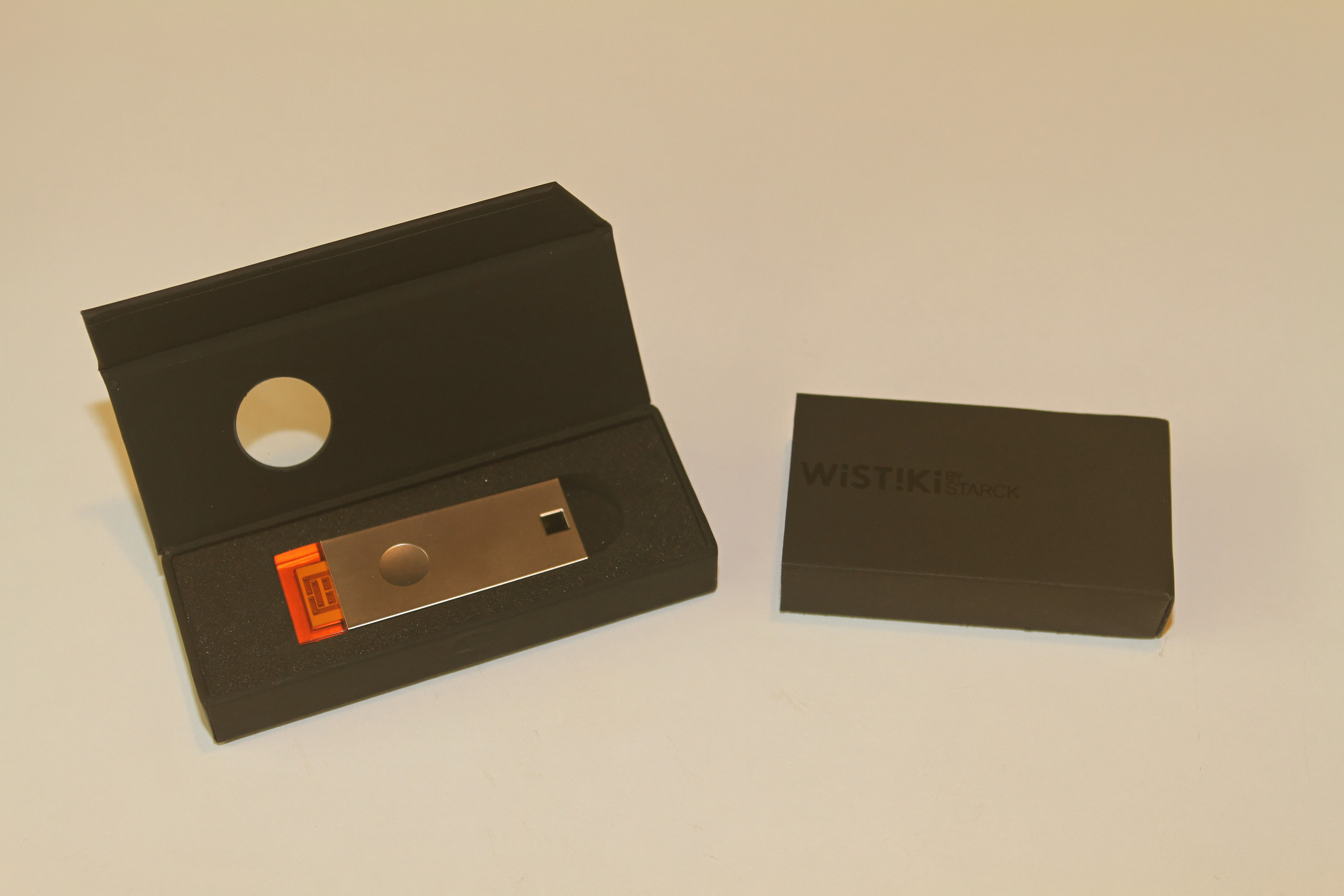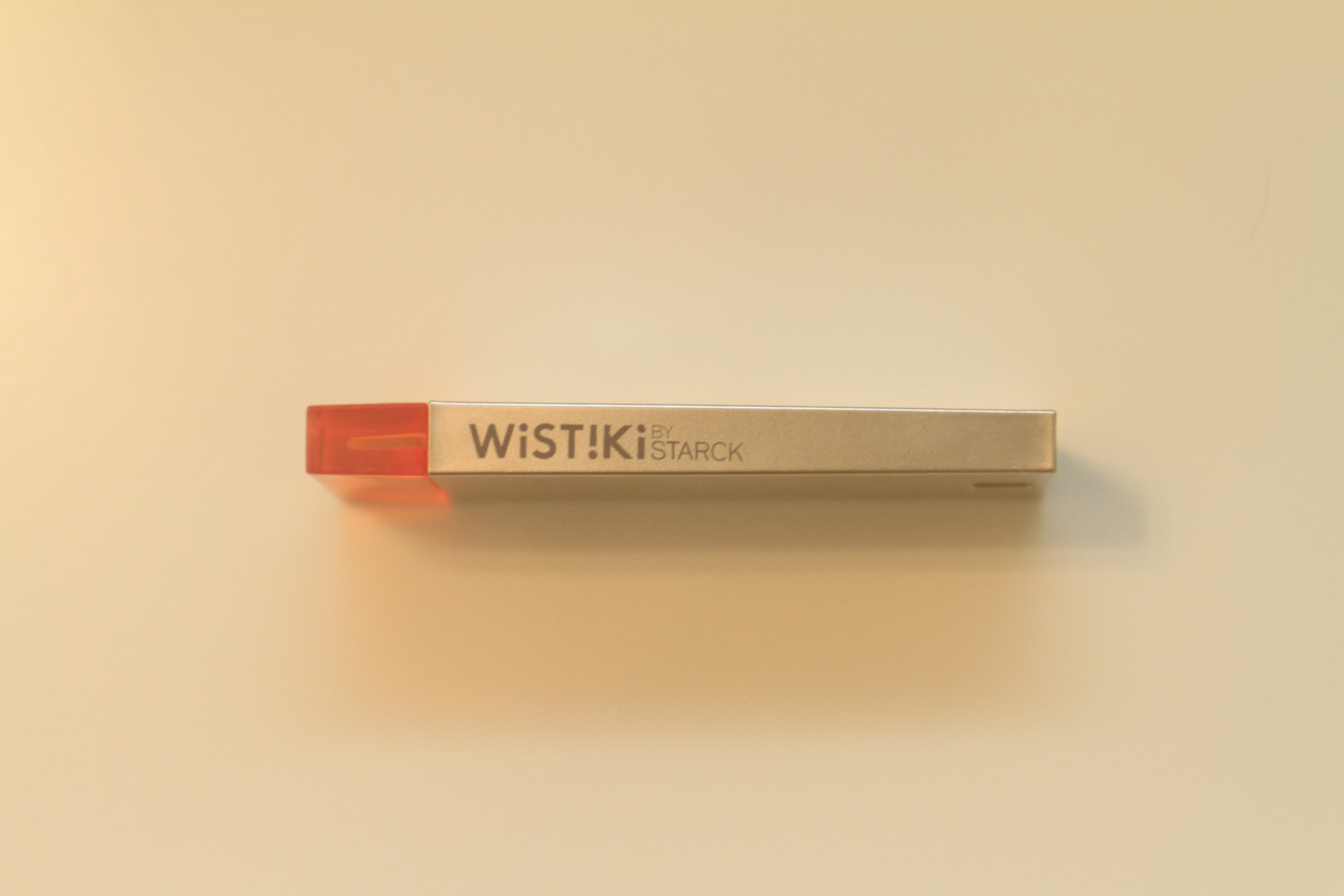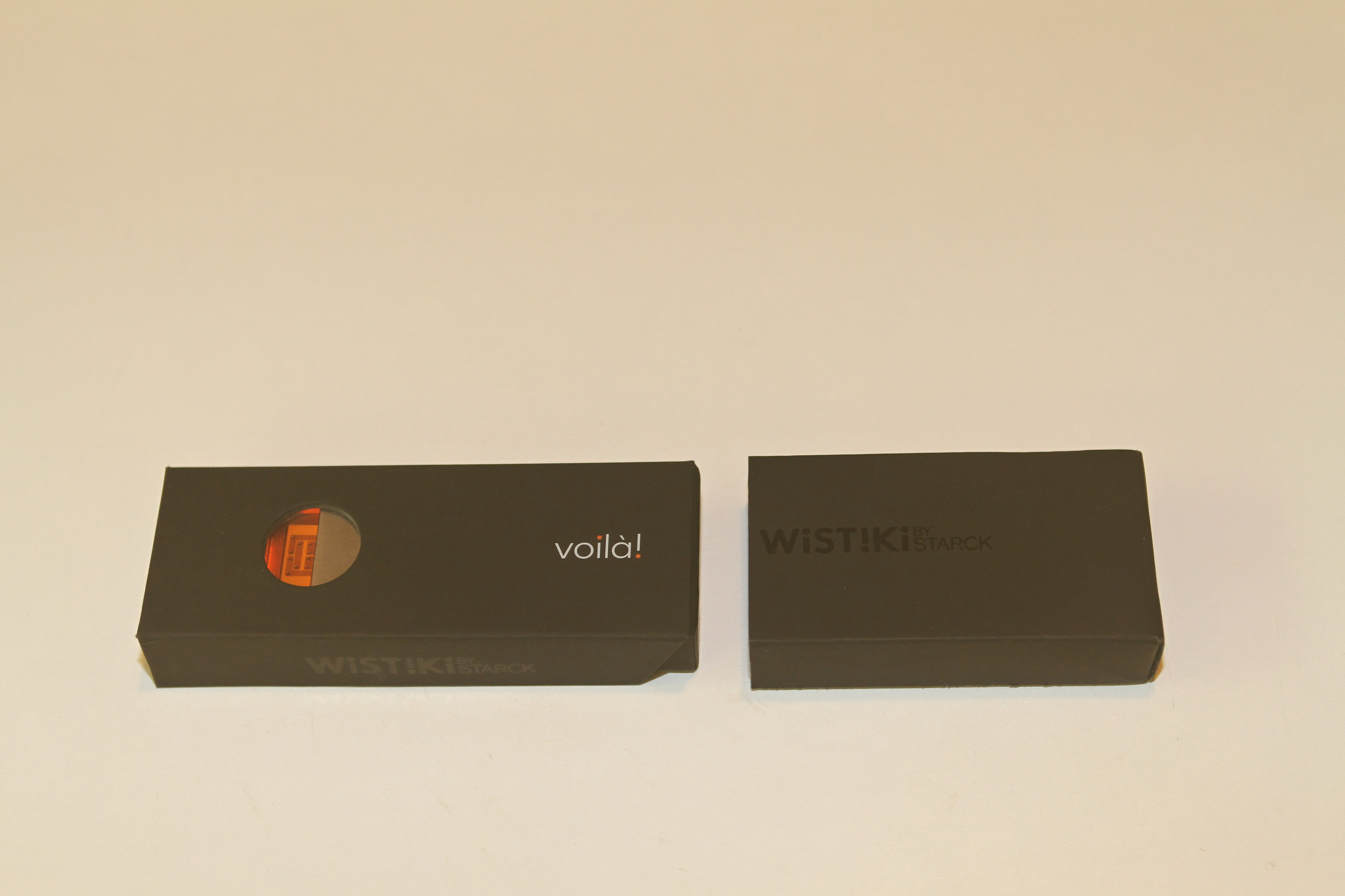 « Voilà ! » est livré dans un coffret cartonné coulissant. Agrémenté de l’inscription « Wistiki by Starck », on comprend très vite que la compagnie a fait appel au célèbre designer, Philippe Starck, pour l’élaboration de son produit. Une fois les deux parties divisées, « Voilà ! » se dévoile à travers un couvercle aimanté et percé d’un cercle qui renseigne sur sa couleur (4 coloris disponibles). Une fois relevé, le couvercle fait apparaitre le traqueur dont le design ne laisse pas indifférent. Si le dessin est harmonieux, la finition séduit par les matériaux employés (aluminium pour le corps et plastique translucide coloré pour la tête). C’est une fois sortie de sa boite que « voilà ! » dévoile tout le savoir faire de « Philippe Starck ». Au delà du poids qui ne dépasse pas 12 g, on est séduit par ses proportions contenus qui ne dépassent les : 62 mm en longueur, 23 mm en largeur et 6 mm d’épaisseur. Une fois en main, « Voilà ! » se contemple comme un objet d’art.